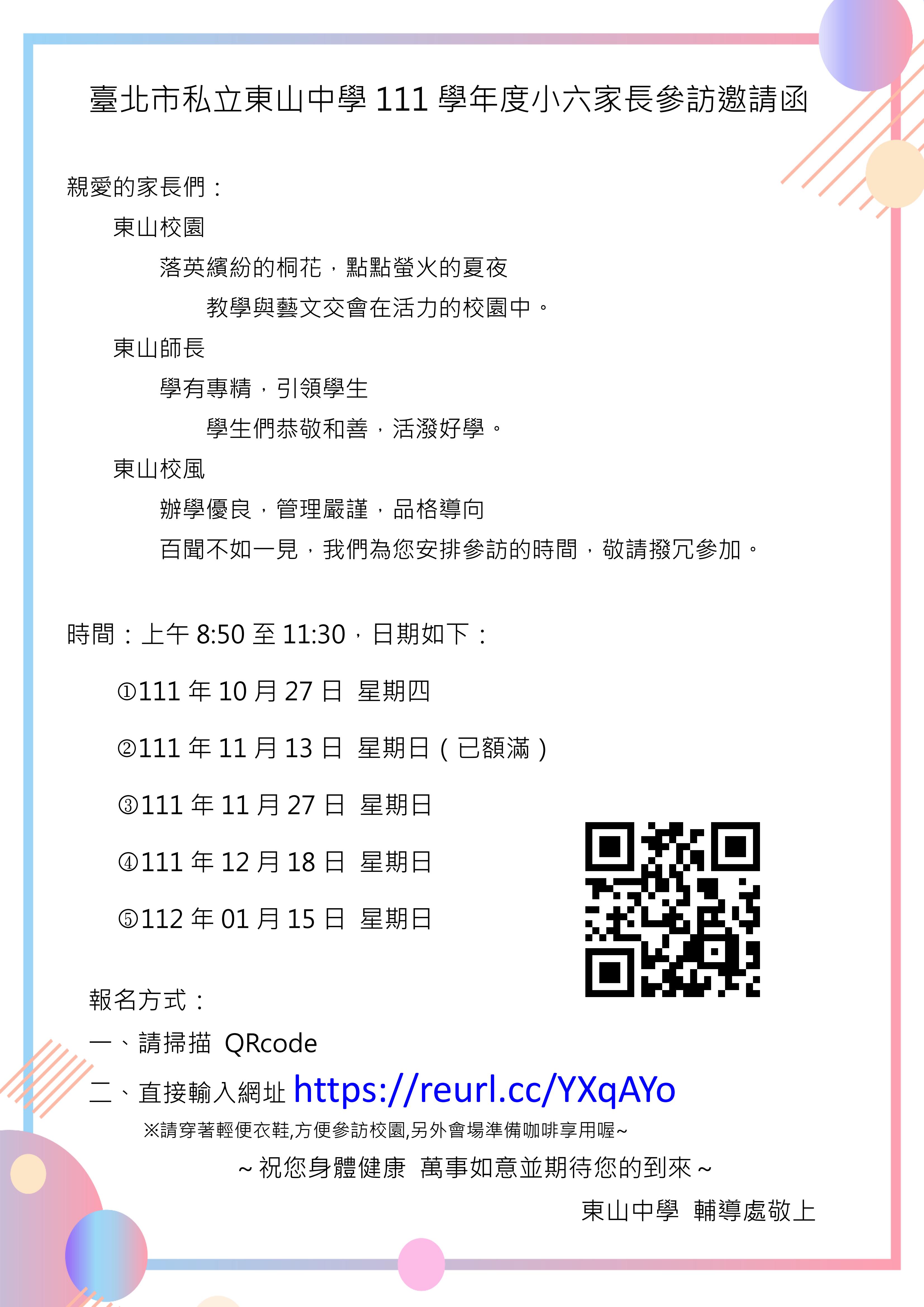 一、活動名稱:臺北市私立東山中學111學年度小六家長參 訪。