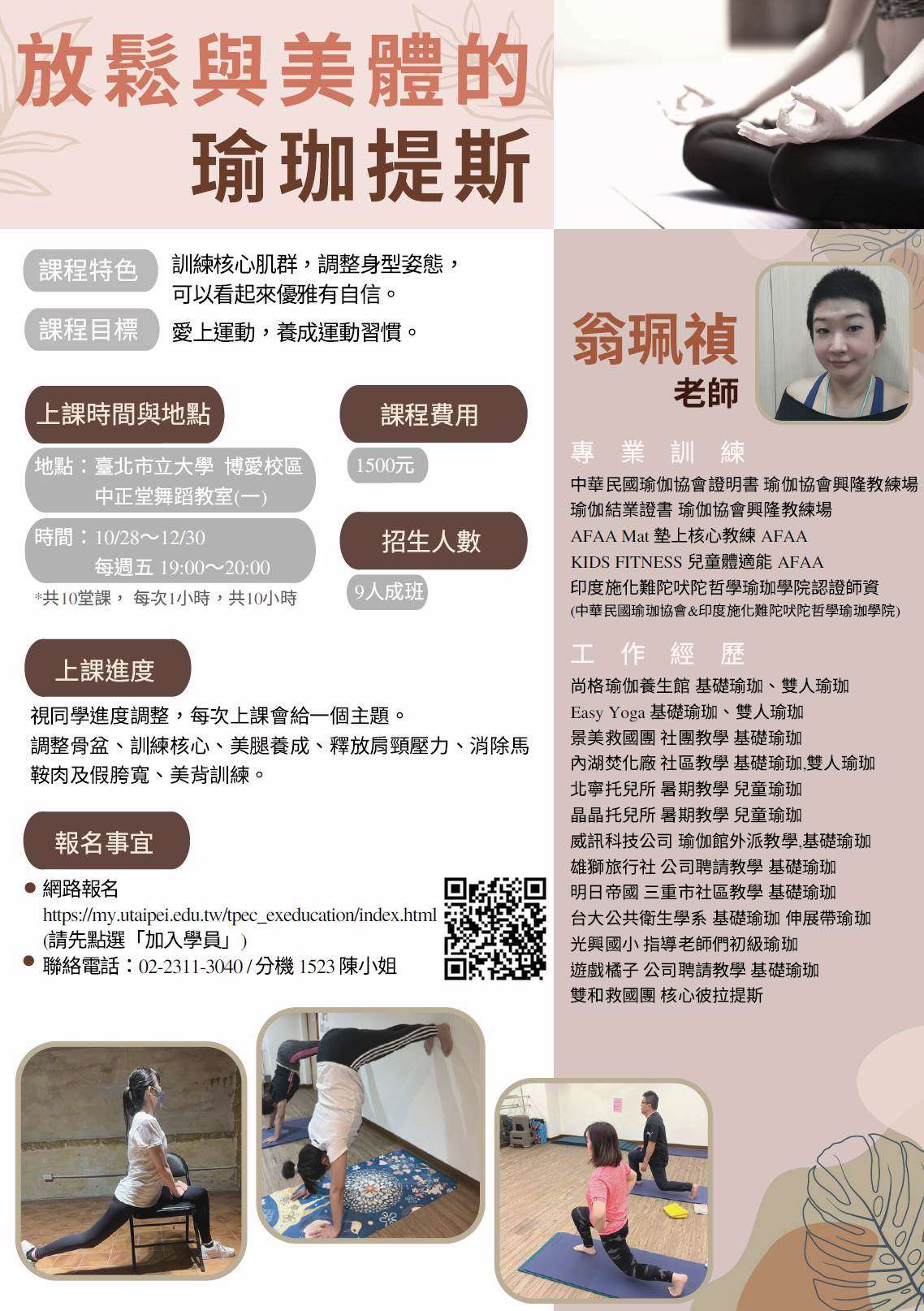 (七)網路報名:請至本處報名網頁報名(https://my. utaipei.edu.tw/tpec_exeducation/index.html)新學員 請先於右上角「加入學員」,再於左欄點選「111-1成人進修-放鬆與美體的瑜珈提斯班」。