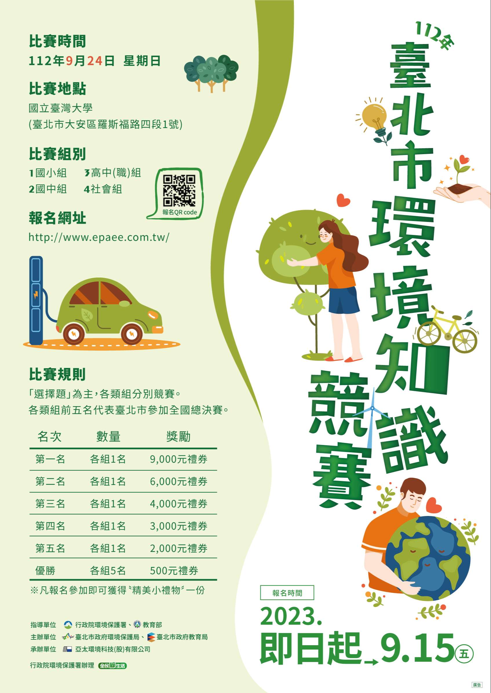 一、本市初賽報名日期至112年9月15日止,一律採網路報名,有意參加者請至活動官網(http://www.epaee.com.tw/)登記報名。