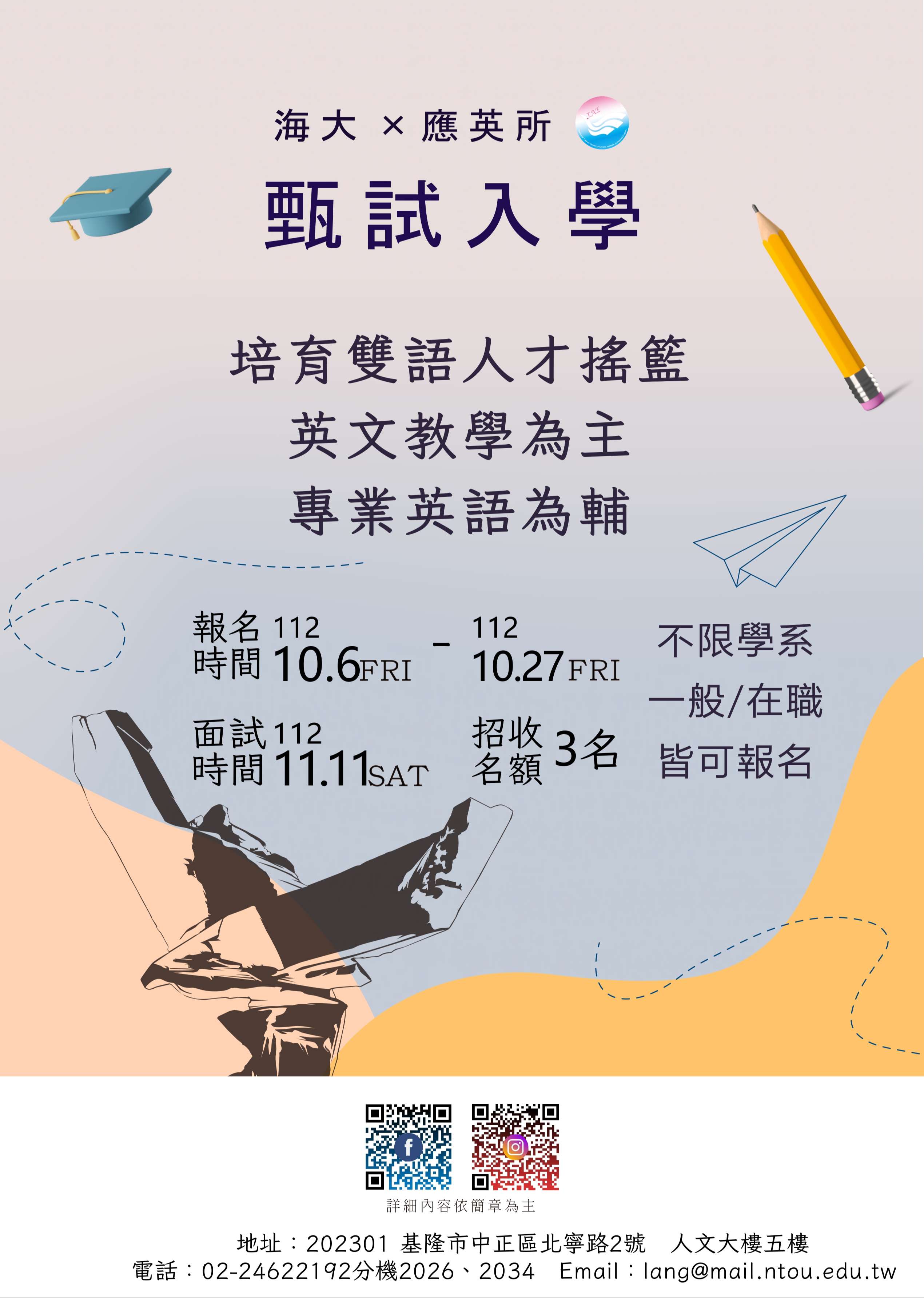 一、因應2030雙語國家政策,英語能力將成為就業必備條件之 一。海大應用英語研究所以英語教學訓練爲主,專業英語 為輔,適合對英語教學有興趣或未來職業欲使用英語者就 讀。 二、本校應用英語研究所113學年度碩士班(甄試入學3名及考試 入學4名)共招收一般生7名。 三、甄試入學報名日期:112年10月6日(星期五)上午8時至112 年10月27日下午5時(星期五)。 四、甄試入學面試日期:112年11月11日(星期六)上午10時。 五、相關資訊請參閱附件招生海報,或請至本校首頁點選「招 生資訊」。 六、參考網址:https://langiae.ntou.edu.tw/。
