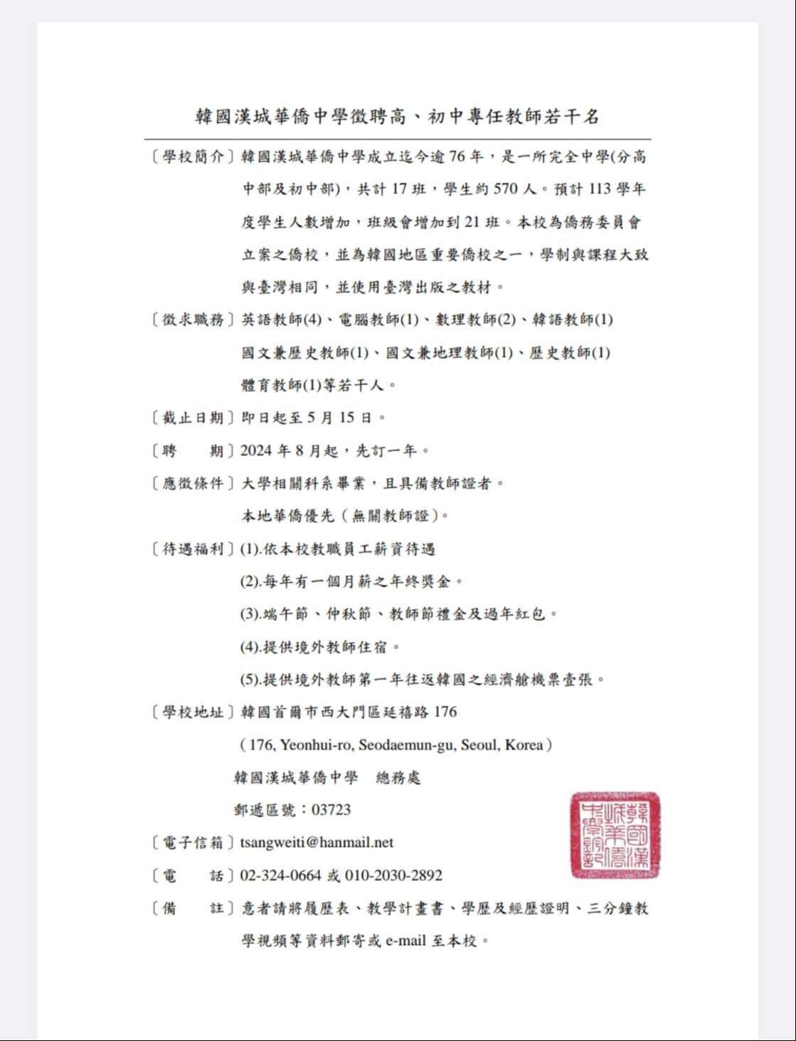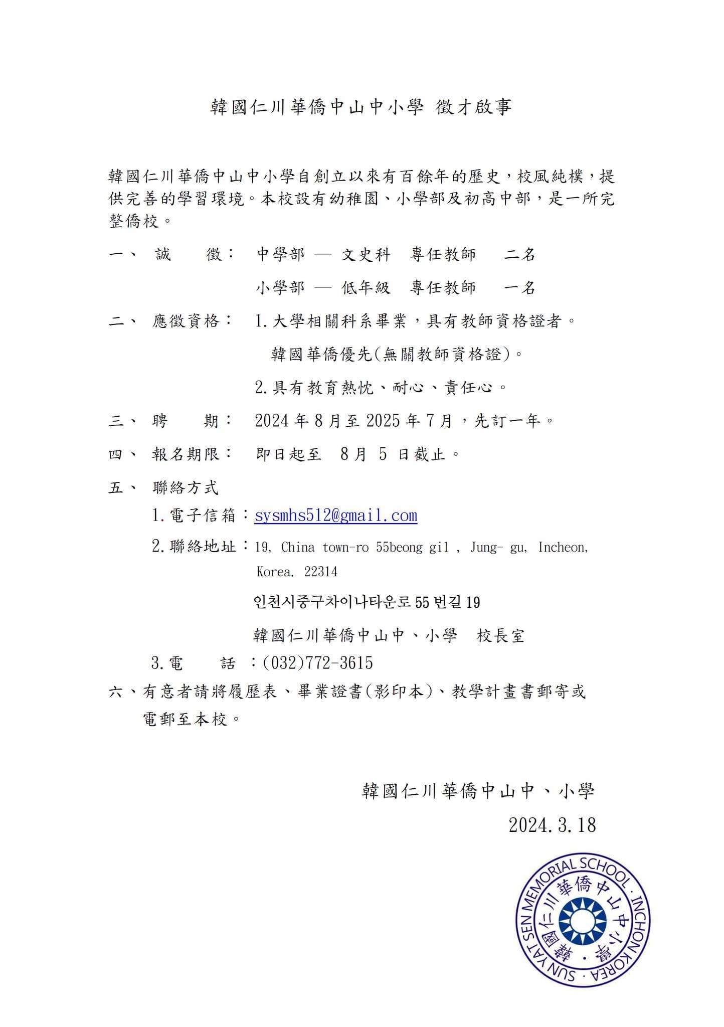 一、依據僑務委員會113年3月28日僑教學字第1130075096A號函 辦理。 二、旨揭僑校擬招聘教師數名,其條件及待遇等資料詳徵才資 訊(如附件);有意應徵者請將初審資料備齊後,逕電 郵、電洽或郵寄至該校辦理。 三、隨函檢附徵才啟事共2則。