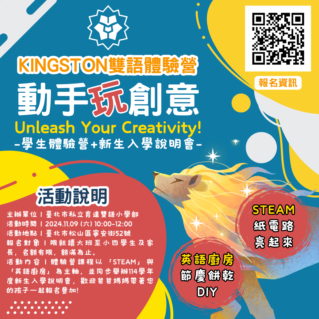 一、目的:點燃孩子的創意火花--【動手玩創意-Kingston雙語 體驗營】。在全球化的時代,雙語能力是孩子未來發展的 重要資產,本次Kingston雙語體驗營集結本校外師與中 師,以「STEAM」與「英語廚房」為主題,設計一系列豐富 有趣的體驗課程,除了規劃精采的手作體驗與科學實驗, 我們也在同一時間安排114學年新生入學說明會,深入介紹 本校的課程規劃與環境導覽,並解答您的所有疑問,歡迎 家長帶著您的孩子一起報名參加!