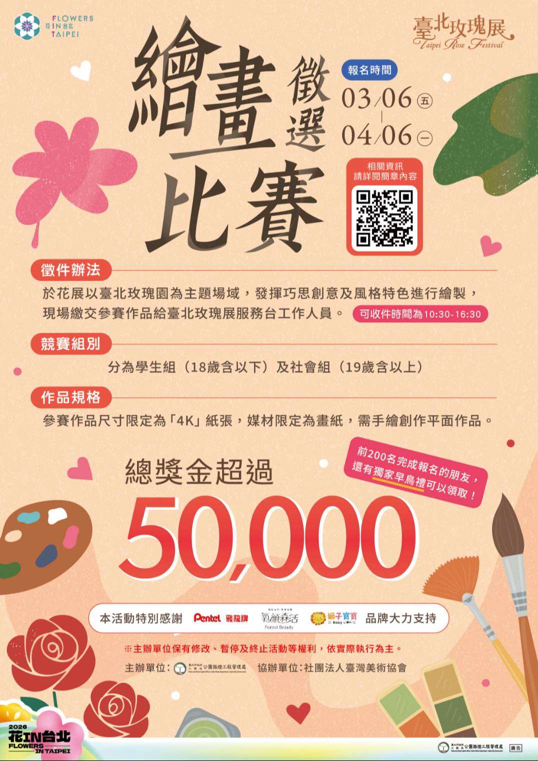 臺北市政府工務局公園路燈工程管理處將於2026臺北玫瑰展期間辦理繪畫徵選比賽,歡迎踴躍參與