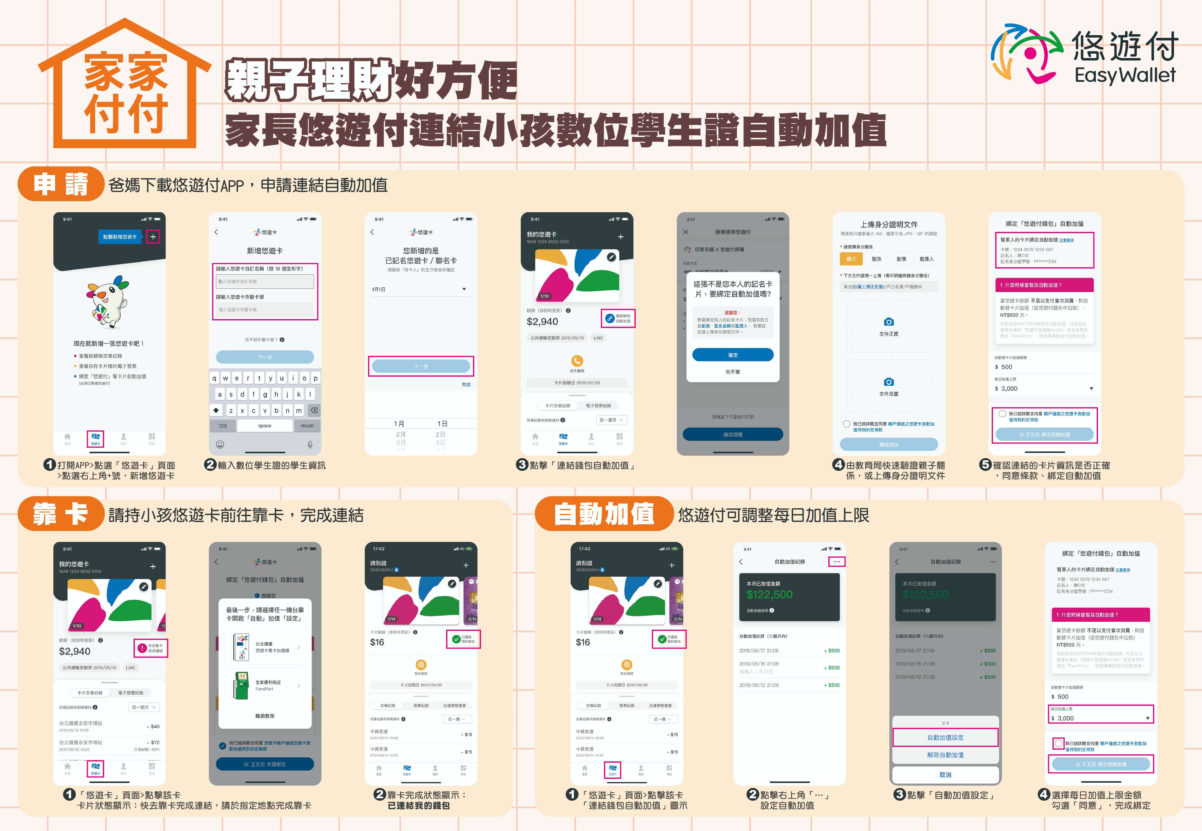三、家長透過3步驟即可完成電子錢包設定(悠遊付綁定數位學生證悠遊卡),為鼓勵家長使用此服務,悠遊卡公司亦提供相關獎勵活動