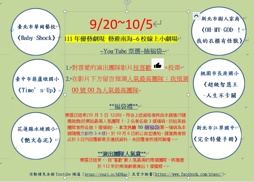 一、111年度表演藝術類競賽因嚴重特殊傳染性肺炎無法現場聆賞,國立臺灣藝術教育館(下稱藝教館)特地舉辦「優藝劇現」創意戲劇比賽網路小劇場推廣活動,邀請創意戲劇優秀團隊至該館南海劇場演出錄影,以網路播映方式,即日起至111年10月5日止在藝教館官方臉書連結YouTube頻道播出,歡迎民眾藉由線上平臺欣賞學生們創意優質戲劇。