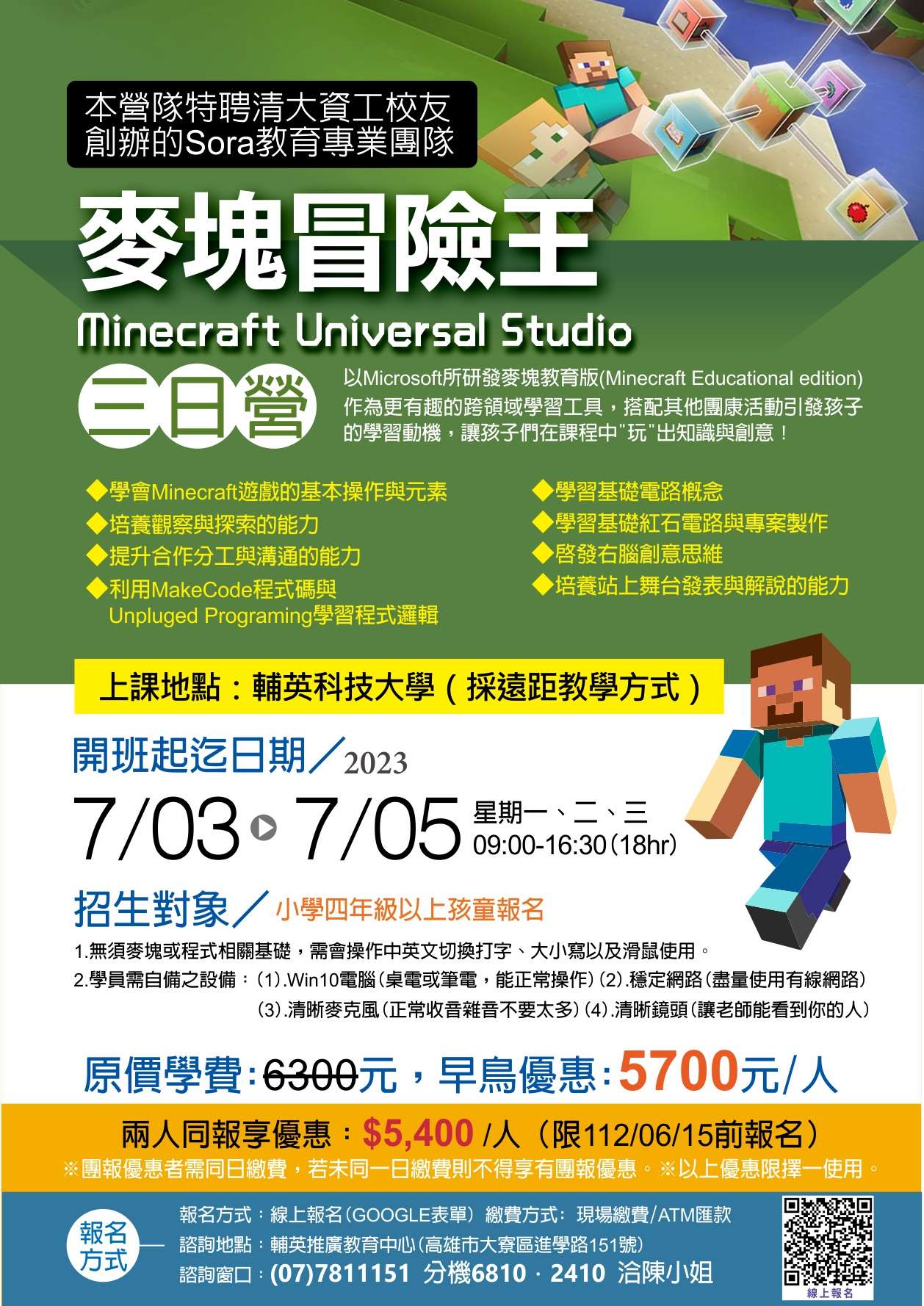 一、課程特色:以Microsoft所研發麥塊教育版(Minecraft Educational edition)作為更有趣的跨領域學習工具,搭配其他團康活動引發孩子的學習動機,讓孩子們在課程中『玩』出知識與創意