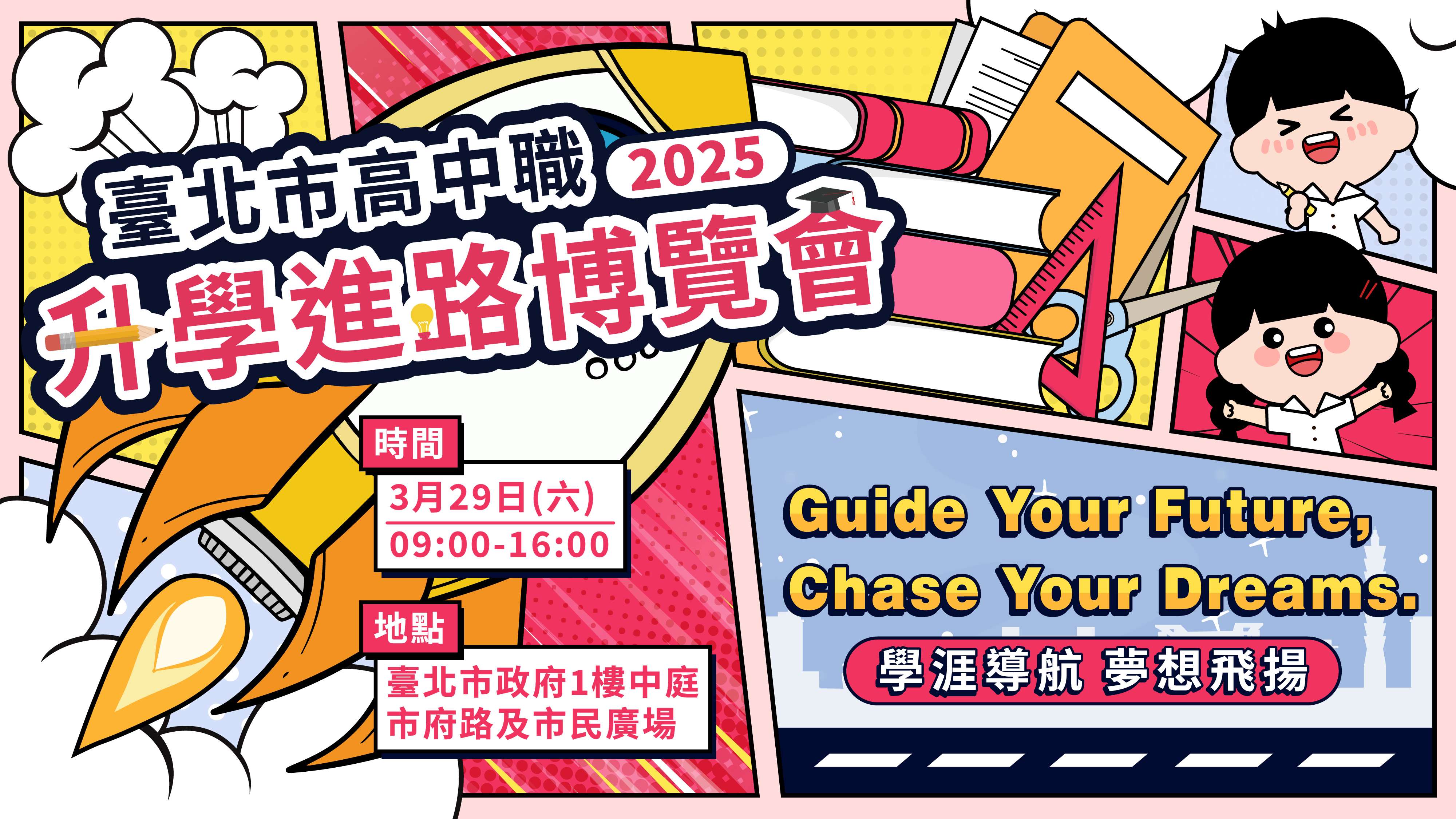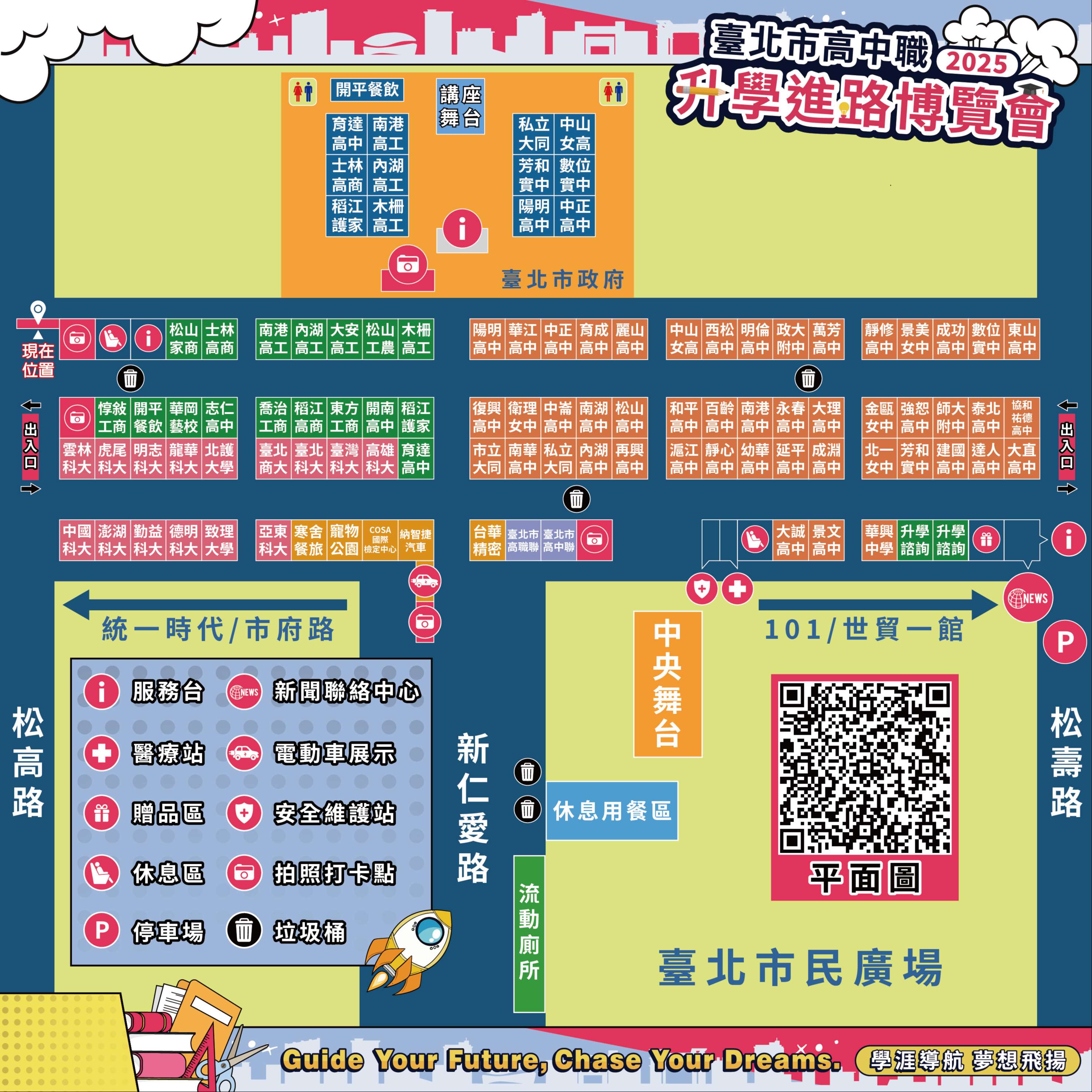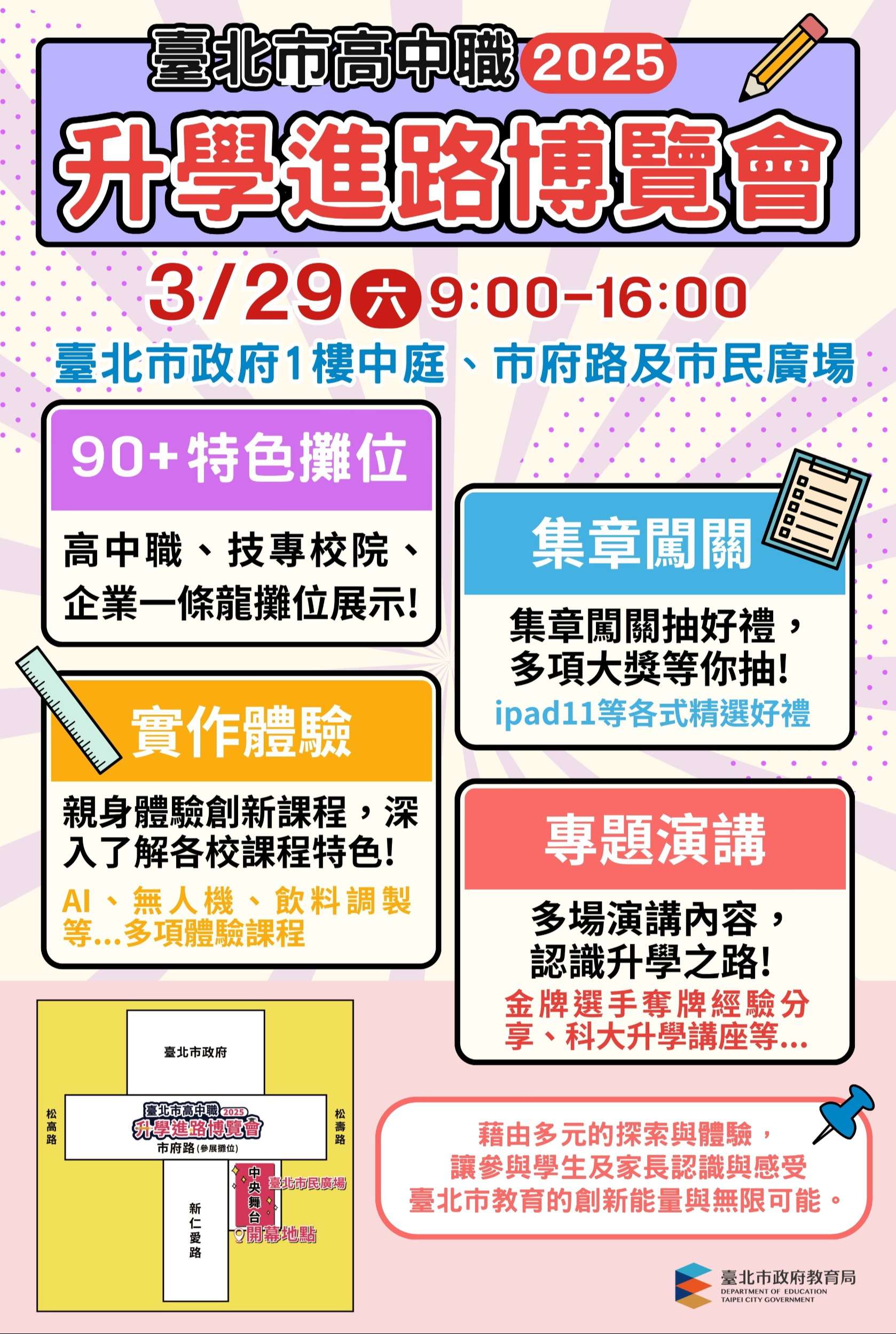 二、檢附臺北市2025年高中職升學進路博覽會宣傳海報、活動 內容及攤位配置各1份,如附件。