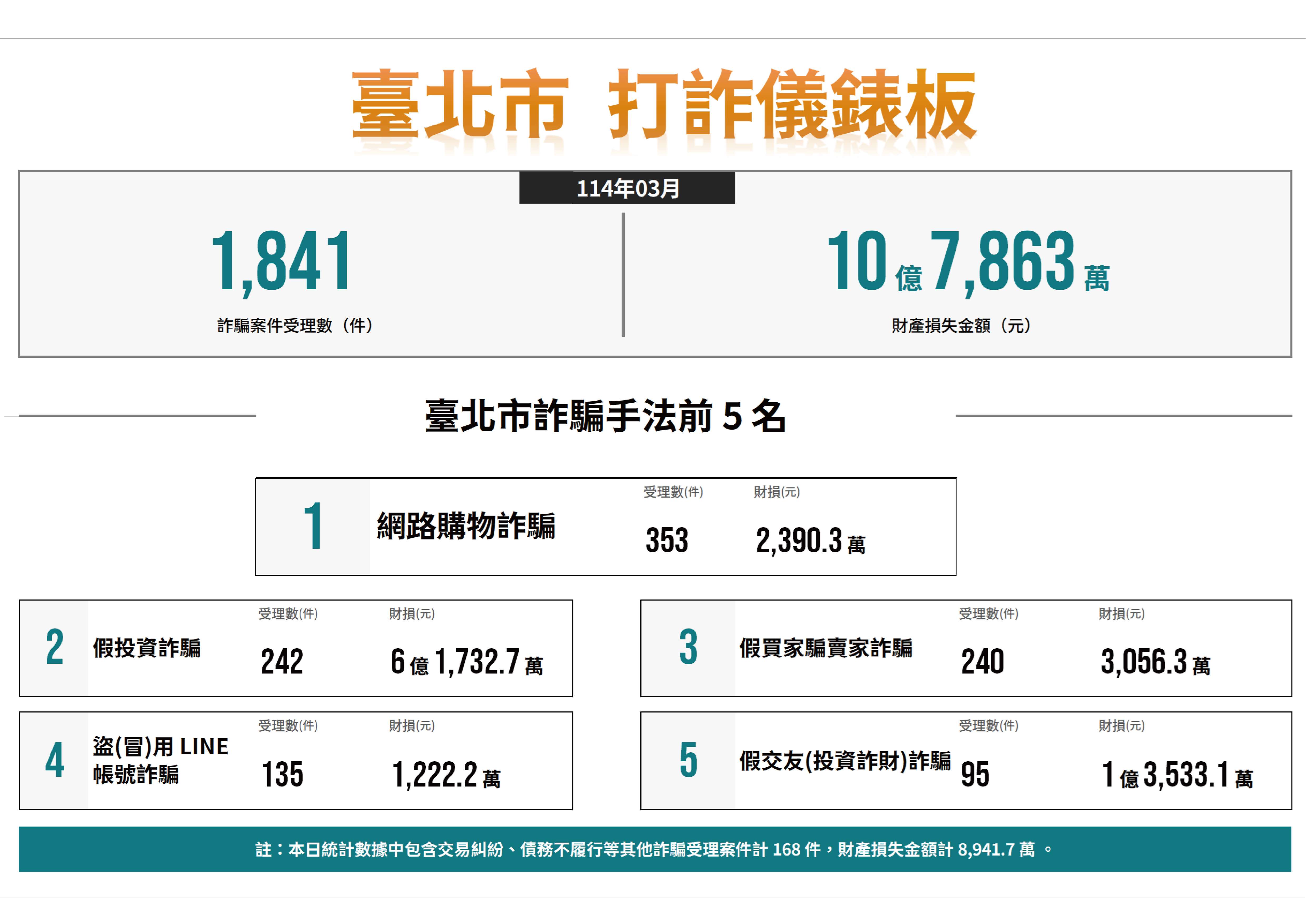 一、分析本市114年3月各類詐欺案件發生數共計1,841件,財損 新臺幣(以下同)10億7,863萬元,前3大詐欺手法受理件 數及財損金額: