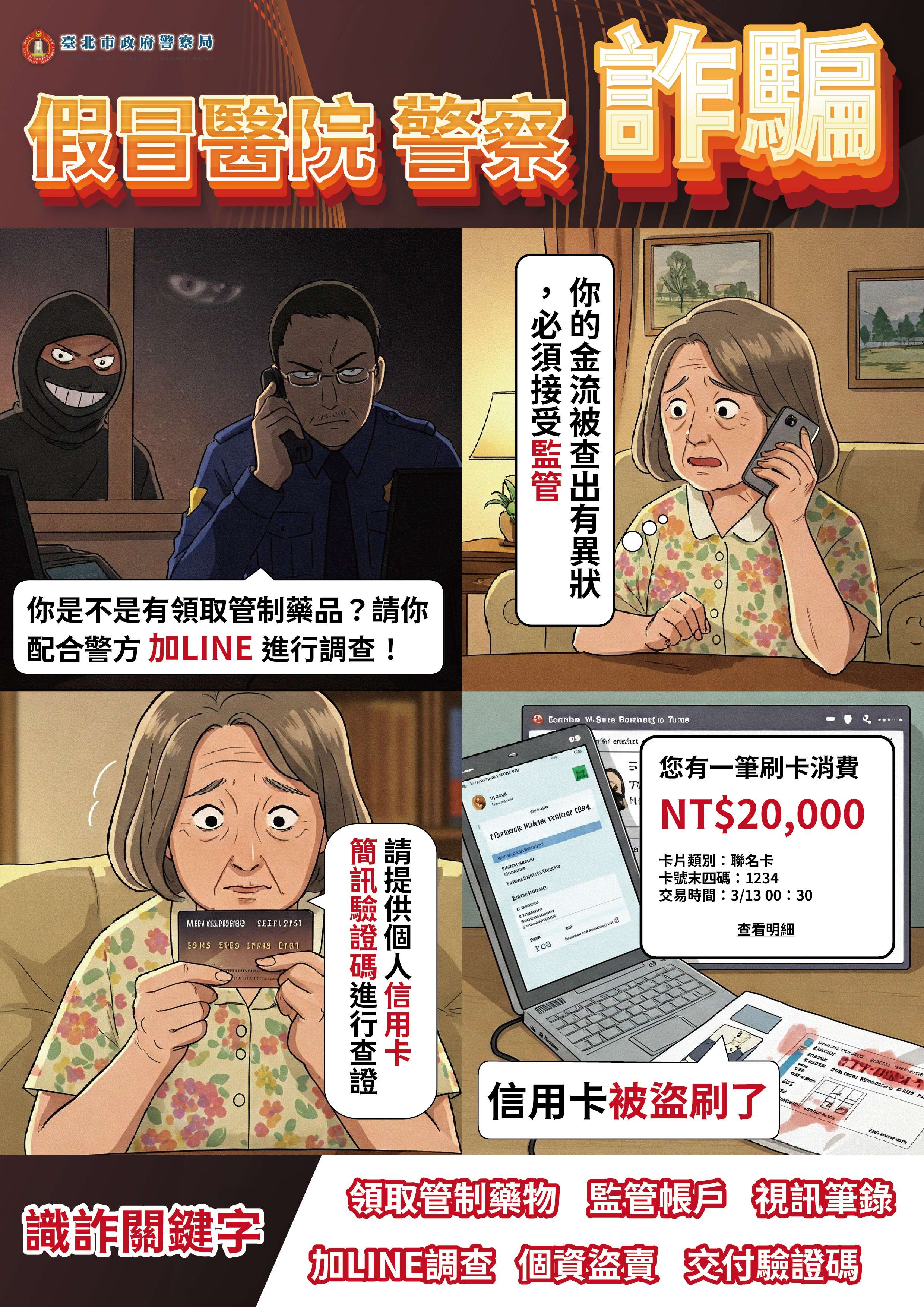 二、因應當前3大高發詐欺手法,近期發現詐騙集團常用「假冒 醫院警察」、「假冒各種身份」及「假冒官方社群平台詐 騙」等方式誘導民眾匯款或被利用個資遭騙,彙整宣導圖 文素材5張(含114年3月份打詐儀錶板數據、4格漫畫案 例、宣導傳單)、影片1部及製作跑馬燈文字稿(附件),作為4月份宣導主軸,並上傳於Google雲端連供各單位下 載,以提升識詐宣導廣度。