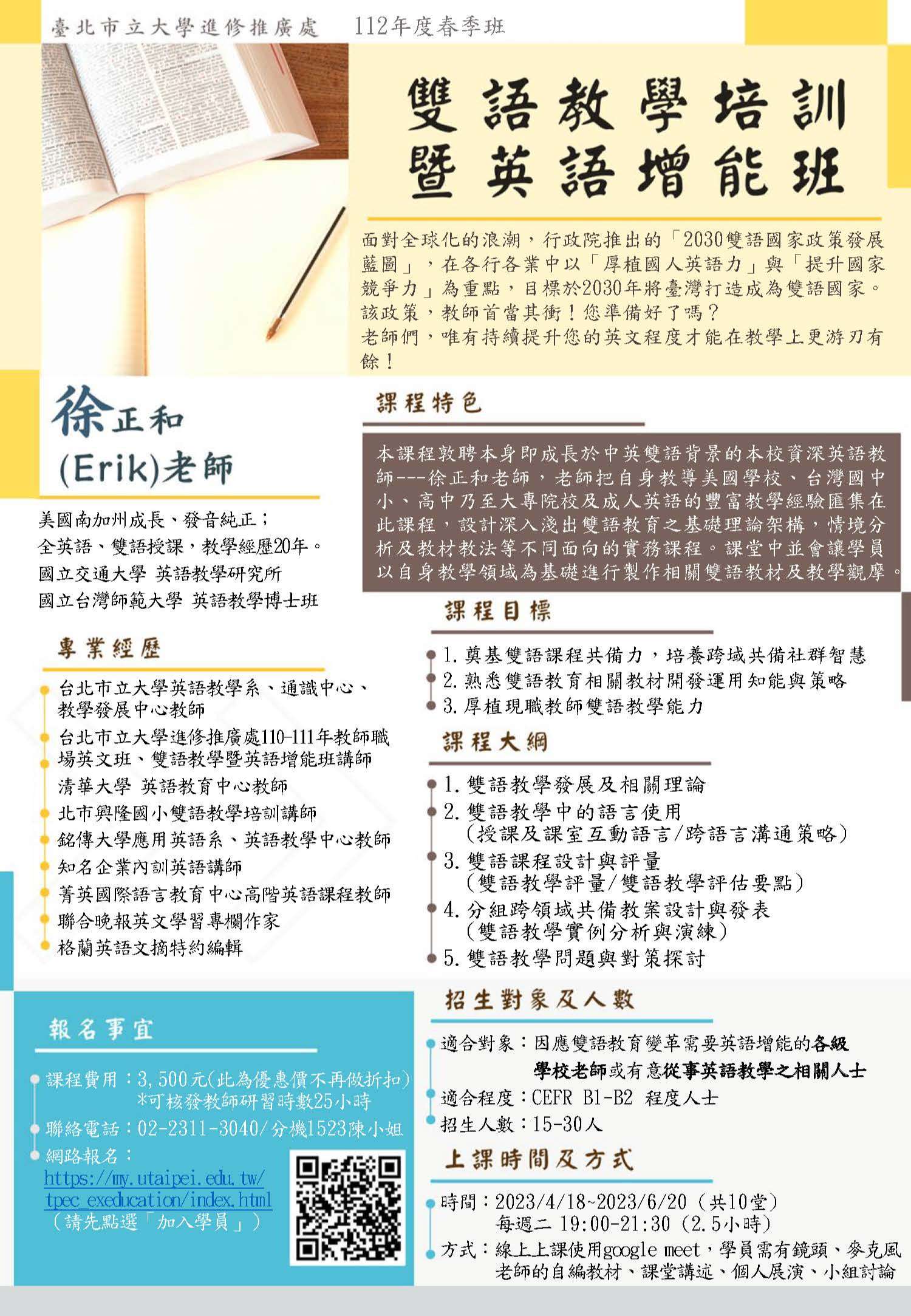 (二)時間:4月18日、4月25日、5月2日、5月9日、5月16日、5月23日、5月30日、6月6日,6月13日、6月20日,每週 二晚上19時至21時30分。 (三)對象:現職幼兒園、國小、國中、高中職老師。 (四)師資:本校英語教學系徐正和教授 (五)學費:3,500元 (六)本課程結束後可取得教師研習時數25小時。 (七)網路報名:請至本處報名網頁報名(https://my. utaipei.edu.tw/tpec_exeducation/index.html)新學員 請先於右上角「加入學員」,再於左欄點選「112春-成 人進修-雙語教學培訓暨英語增能班」。 二、檢附課程宣傳海報。 三、如有報名疑問,請電洽承辦人陳小姐(02- 23113040#1523)。