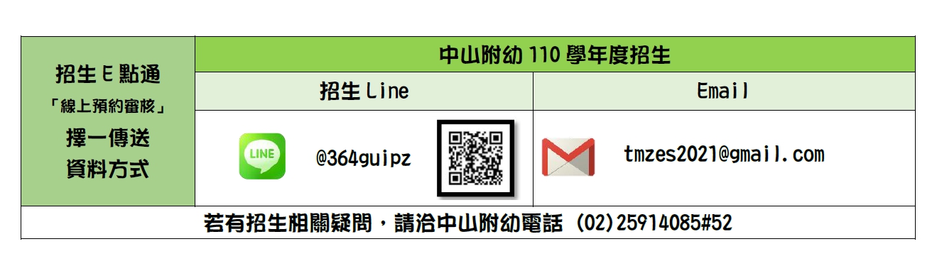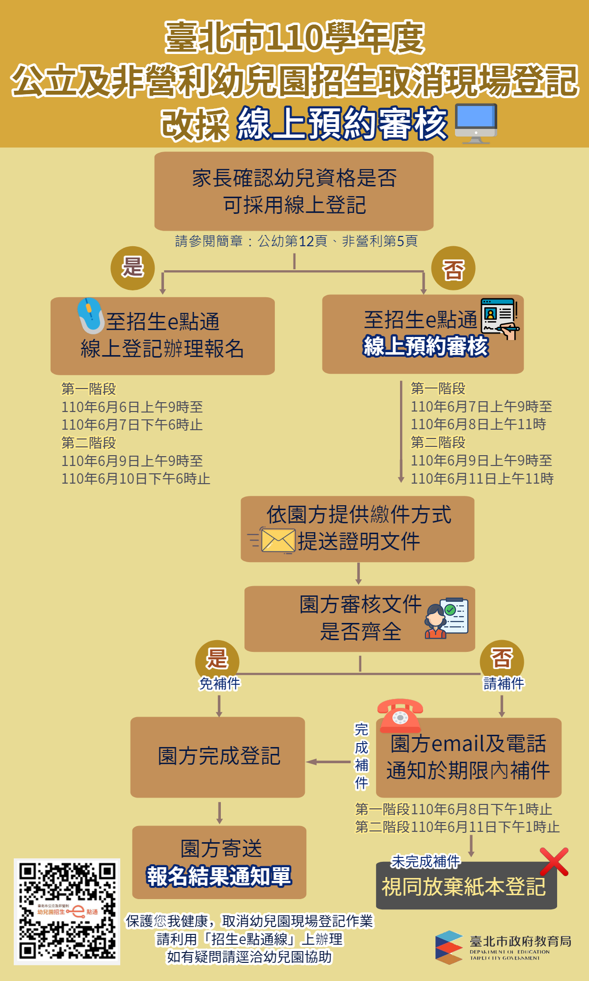 一、本校幼兒園110學年度招生各階段「現場報名登記」調整為「線上預約審核」方式辦理。