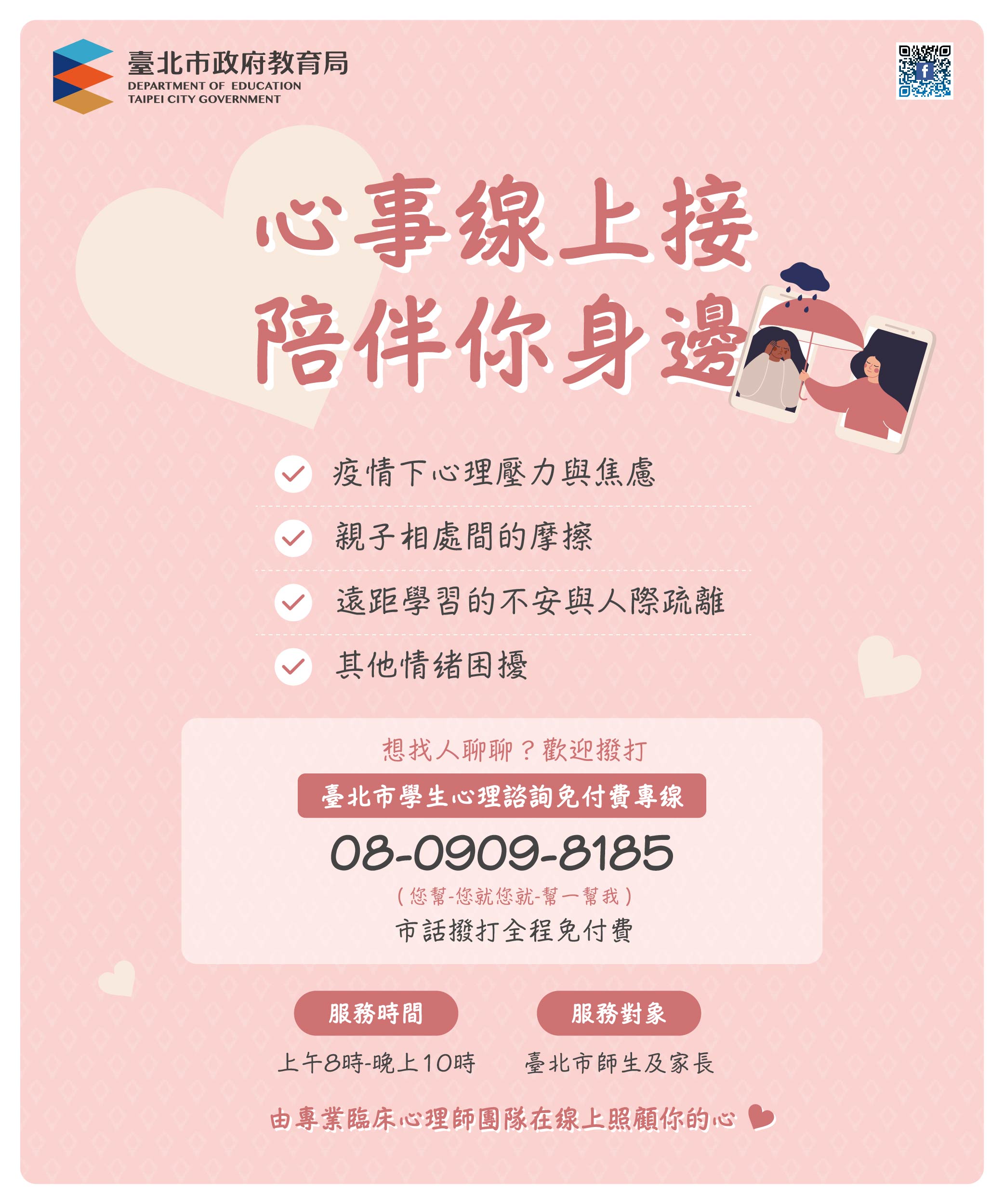 二、因應嚴重特殊傳染性肺炎(COVID-19,簡稱新冠肺炎)疫情全國進入第三級警戒,本市各級學校延長停課至110年7月2日,為提供本市全體親師生更完善之心理健康資源運用,本局建置「臺北市學生心理諮詢免付費專線」,引進專業臨床心理師團隊提供電話諮詢服務,期增進親子溝通與互動效能、並提供有壓力或情緒困擾之學生或家長諮詢管道。