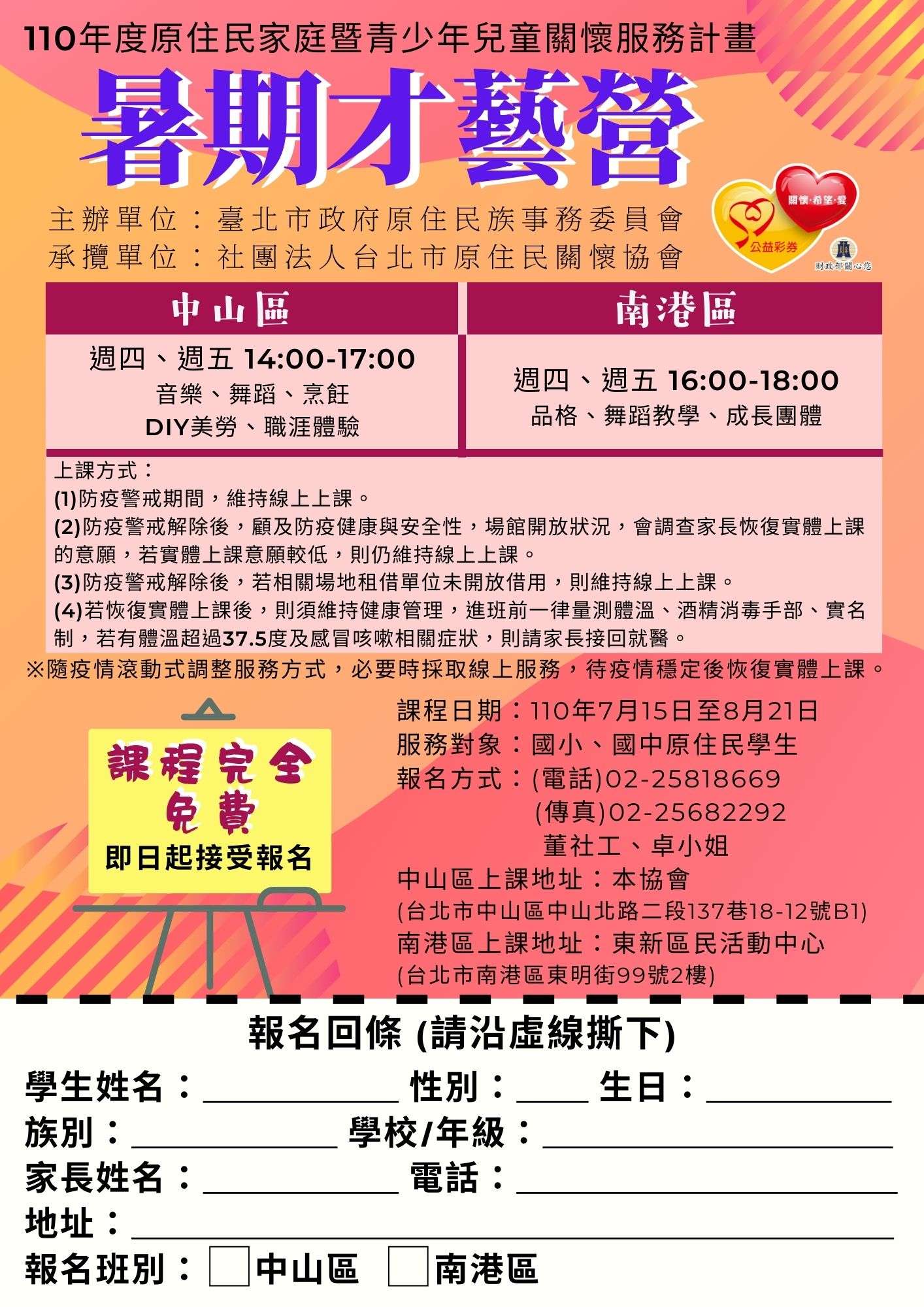 社團法人台北市原住民關懷協會辦理「110年臺北市原住民兒童暨青少年關懷服務計畫」線上暑期才藝營宣傳報名表