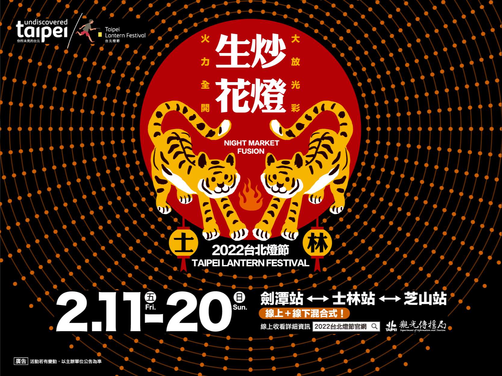 「2022台北燈節」活動訂於111年2月11日(星期五)起至2月20日(星期日) 止,於士林美崙公園展示「2022臺北燈節」全國各級學校花燈競賽作品,活動網址如下: