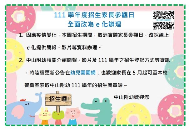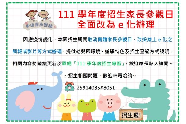 因應疫情變化,本園招生期間,取消實體家長參觀日,改採線上e化簡報或影片等方式辦理,