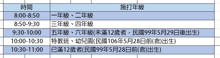 ê接種時間表(請依安排時間準時到校報到,逾時不候)