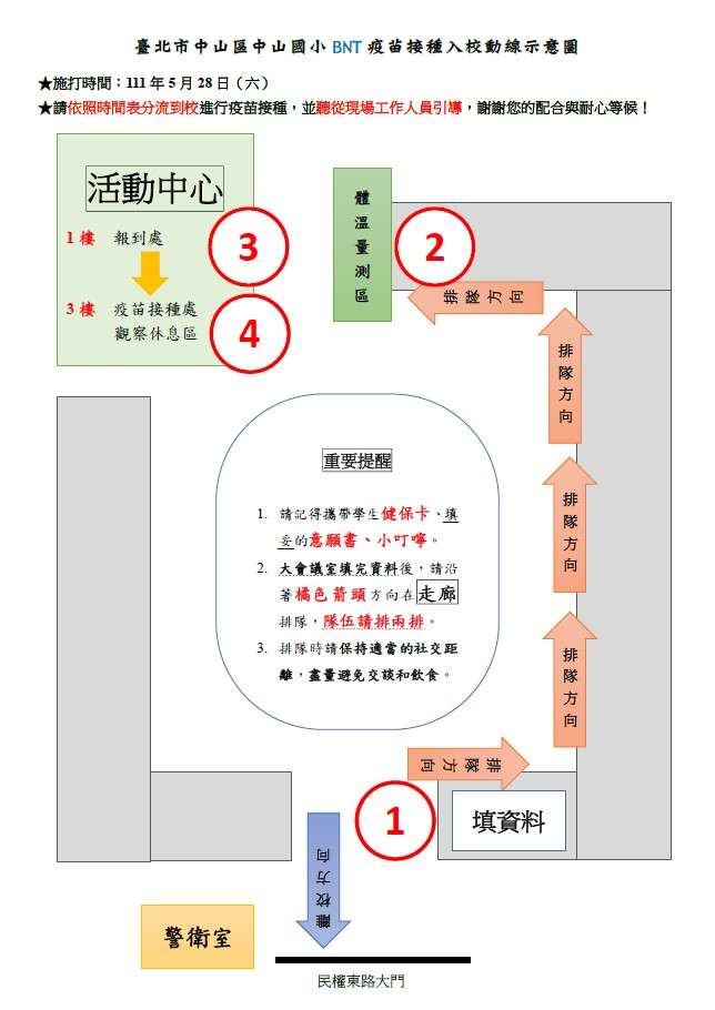 因此,本校原訂施打時間為6月16日(四),因應市府政策規定,提前至5月28日(六)上午8:00施打,地點於本校活動中心三樓。當天請配合分流時段及動線規劃,準時到校。