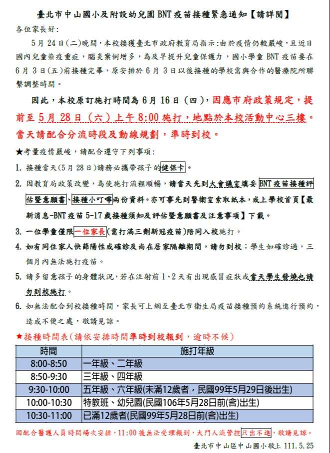 5月24日(二)晚間,本校接獲臺北市政府教育局指示:由於疫情仍較嚴峻,且近日國內兒童染疫重症,腦炎案例增多,為及早提升兒童保護力,國小學童BNT疫苗要在6月3日(五)前接種完畢,原安排於6月3日以後接種的學校需與合作的醫療院所聯繫調整時間。