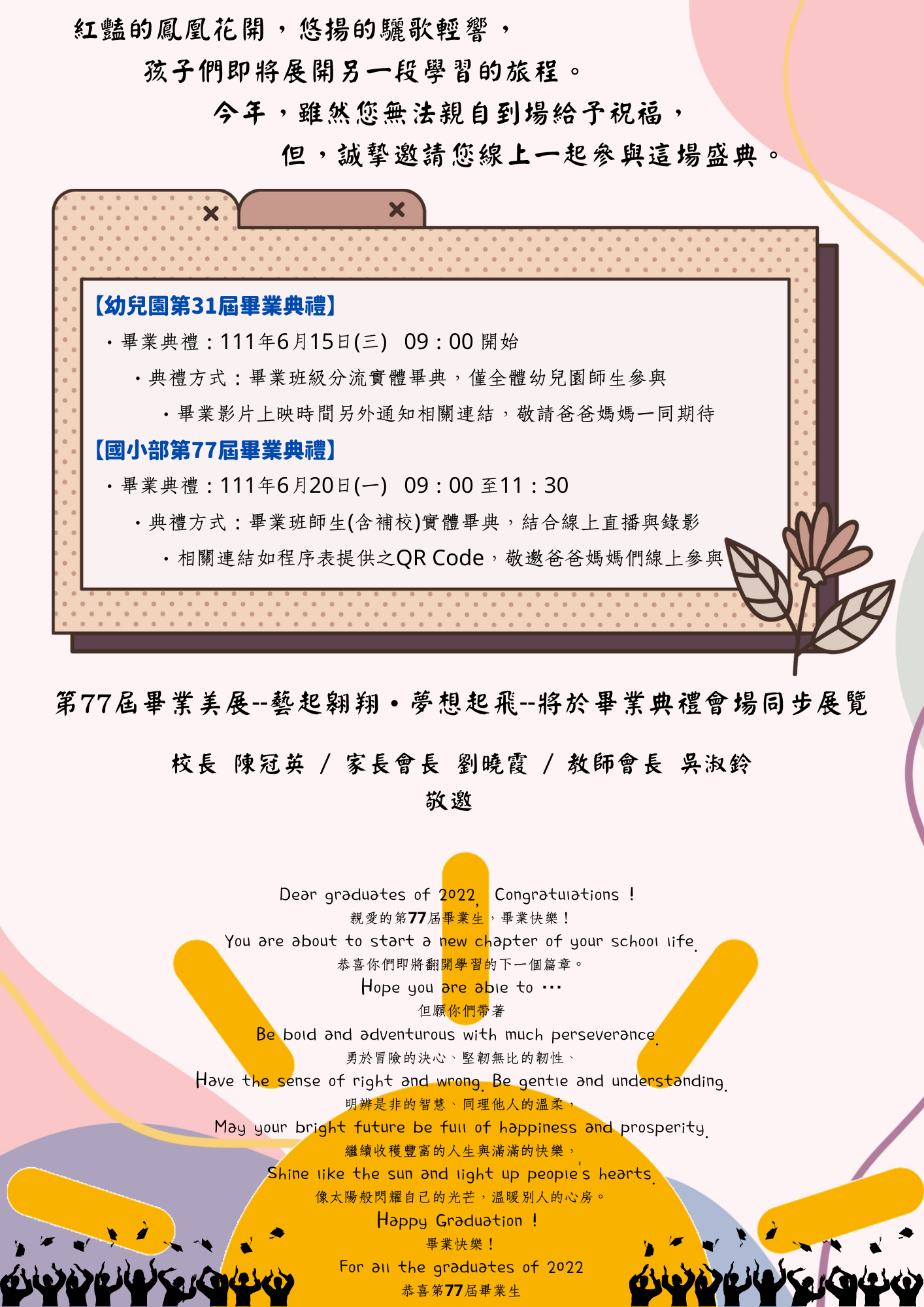 雖然今年您們無法親自到場給予孩子祝福,但中山國小全體師生仍誠摯邀請您以線上連結的方式,一同參與這場盛宴。