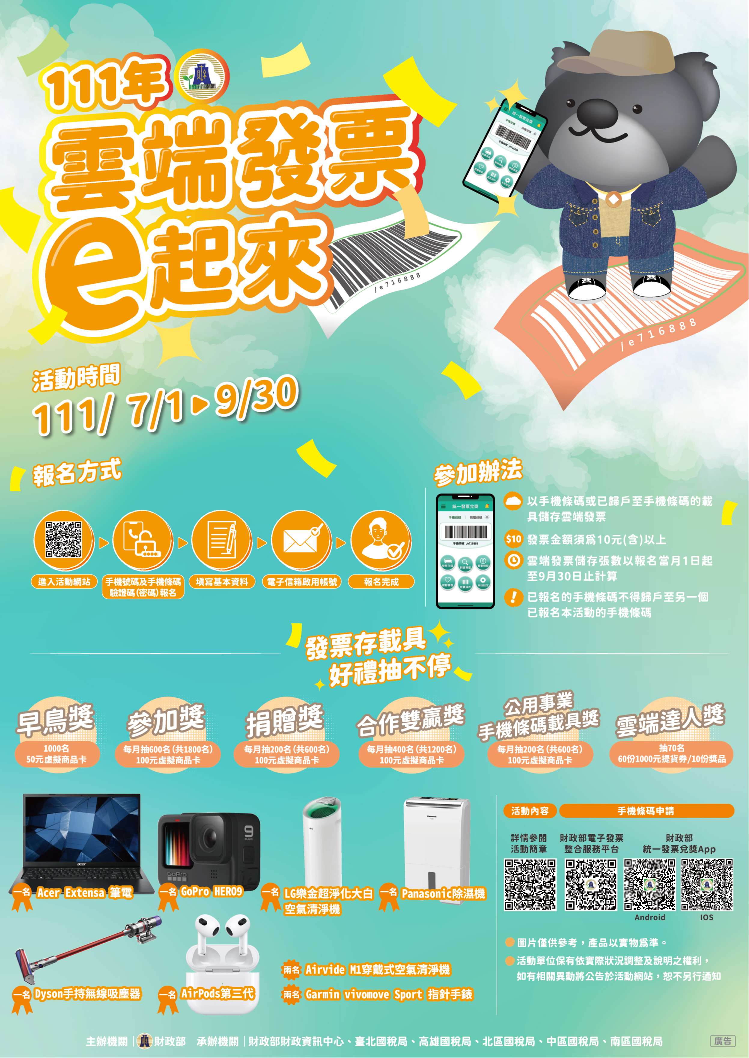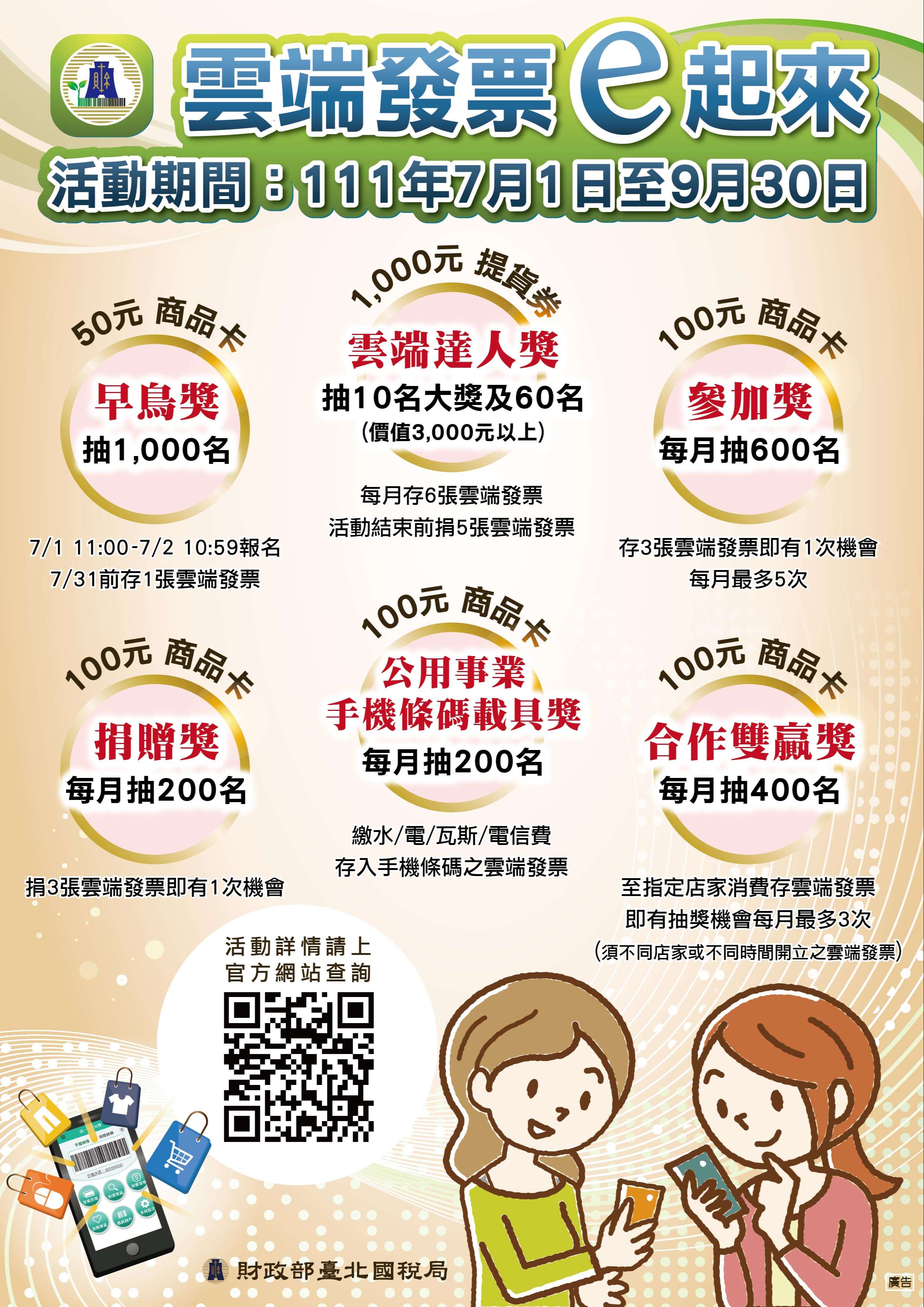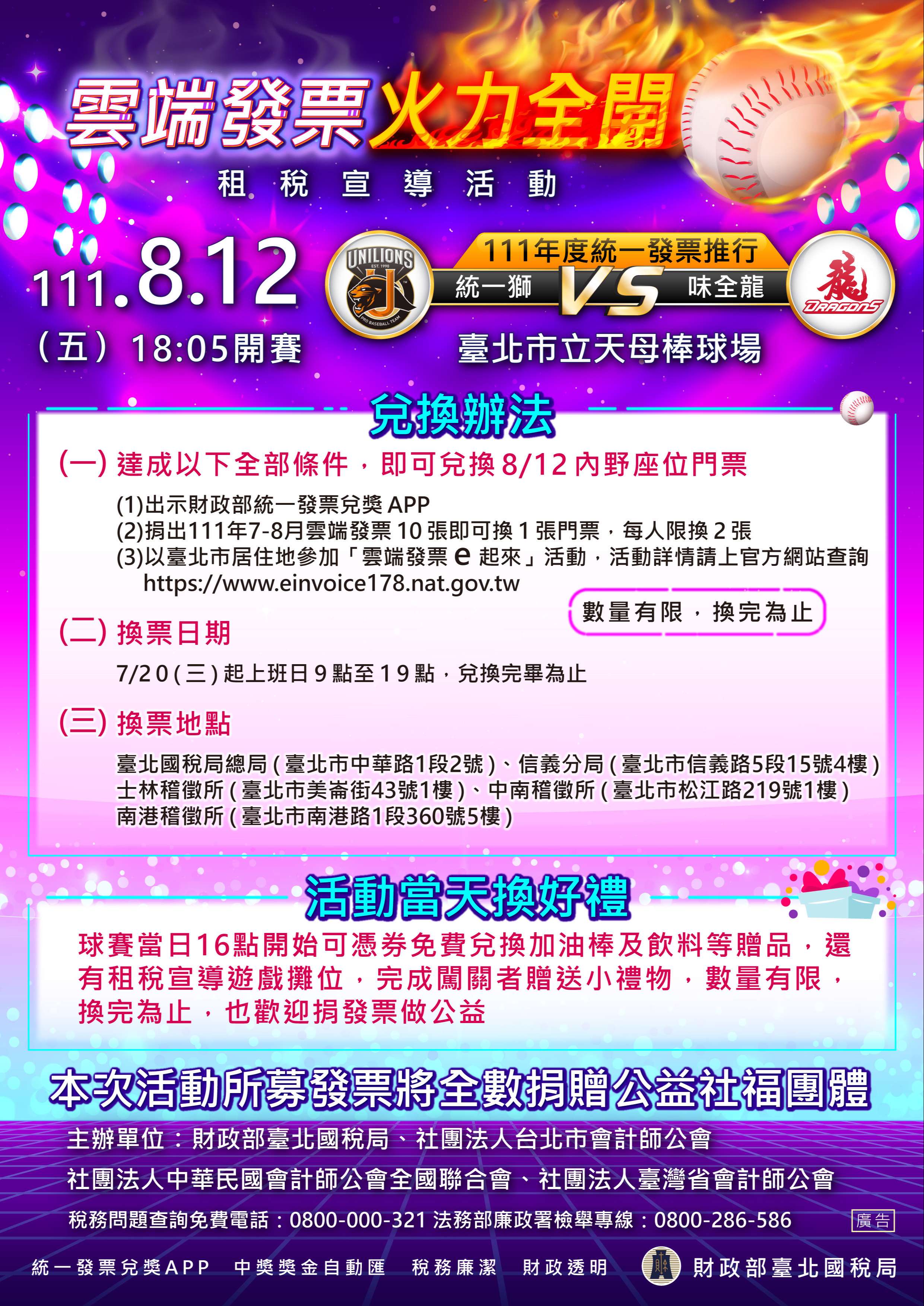 為推廣與普及使用雲端發票,將雲端發票融入日常生活, 財政部舉辦111年「雲端發票e起來」活動,另財政部臺北國稅局中南稽徵所舉辦 「雲端發票火力全開」租稅宣導活動,自111年7月20日起開放民眾以雲端發票換取門票,於111年8月12日假天母棒球場設立宣導攤位,歡迎大家踴躍捐發票、做公益,詳細情形請參閱宣導海報。