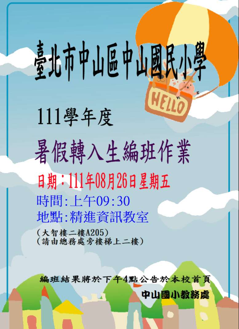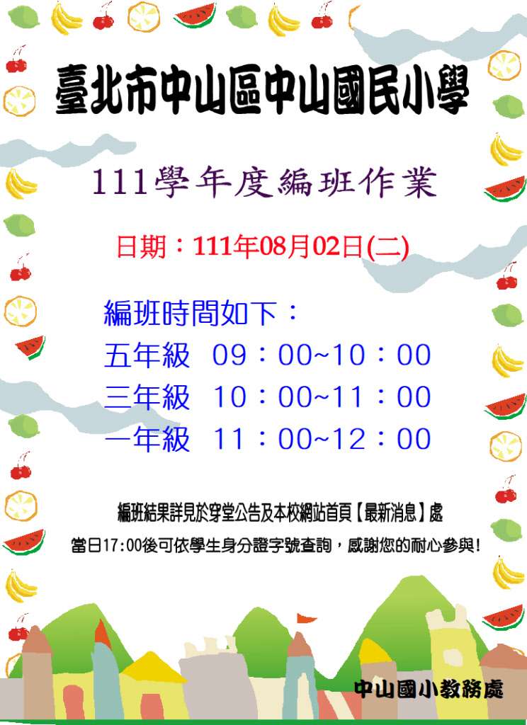 2. 8月26日(五)下午五時前,一年級補報到新生及二至六年級轉入生之編班結果,將公告於校網首頁【最新消息】處。