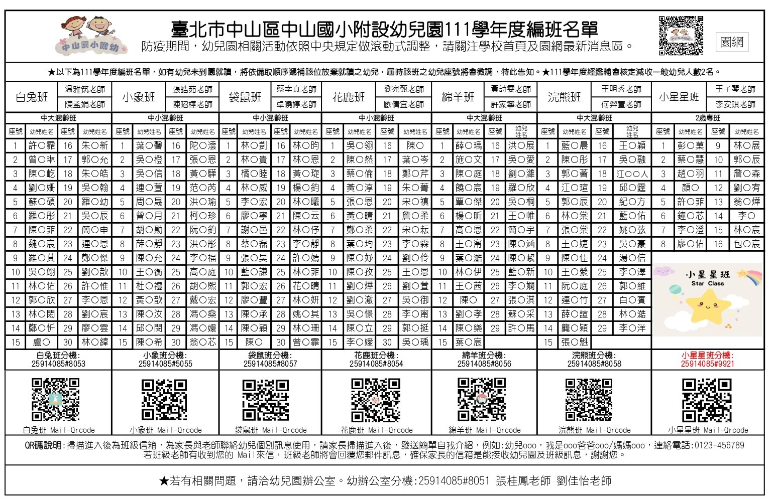 身體健康情形與學習狀況,請家長保持電話暢通。 ★以下為111學年度編班名單,如有幼兒未到園就讀,