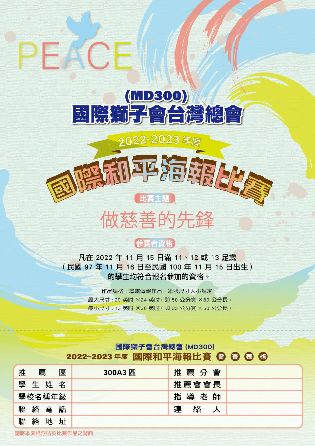 凡在 2022年11月15 日滿11、12或13足歲(民國97年11月16日至民100年11月15日出生)的學生均符合報名参加的資格