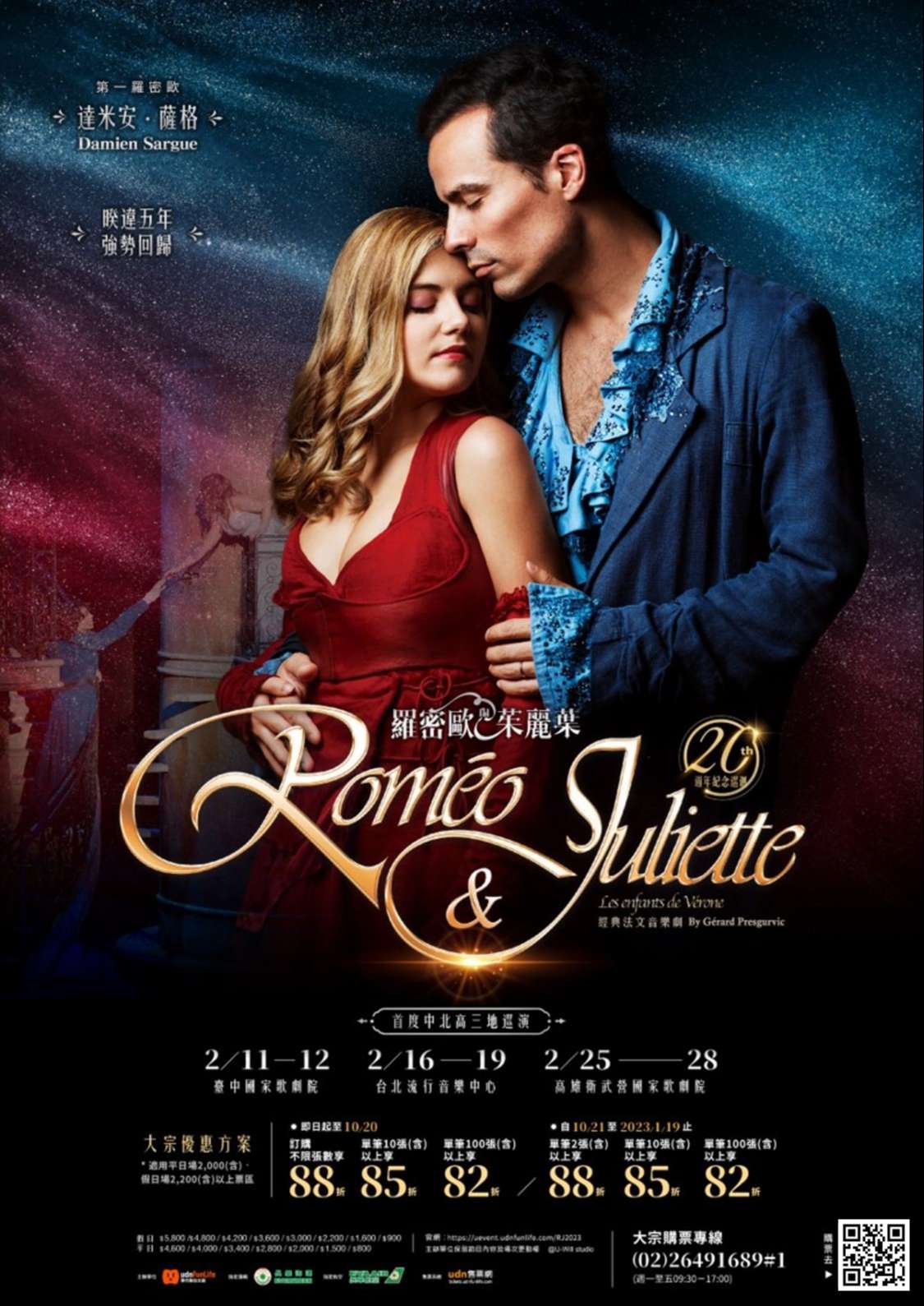 (三)表演介紹:改編自英國文豪莎士比亞的經典作品「羅密歐與茱麗葉」,是當今唯一用「音樂劇」及「法文」形式來呈現這不朽愛情故事的創作。經典故事、融合流行及古典風格的動人歌曲,再加上高達2.5億製作費的華麗精緻服裝場景,於2001年巴黎首演後,歷經多年演出已被翻譯超過10多種語言版本,莎翁經典再次造成全球轟動!至今已累積全球超過650萬人次觀賞紀錄,奪得「21世紀最偉大的流行音樂劇」之美讚。不僅在戲劇成就上佳評如潮,劇中歌曲更登上各國排行榜冠軍,創下百萬張銷售紀錄,是您不容錯過的叫好叫座經典法文音樂劇。