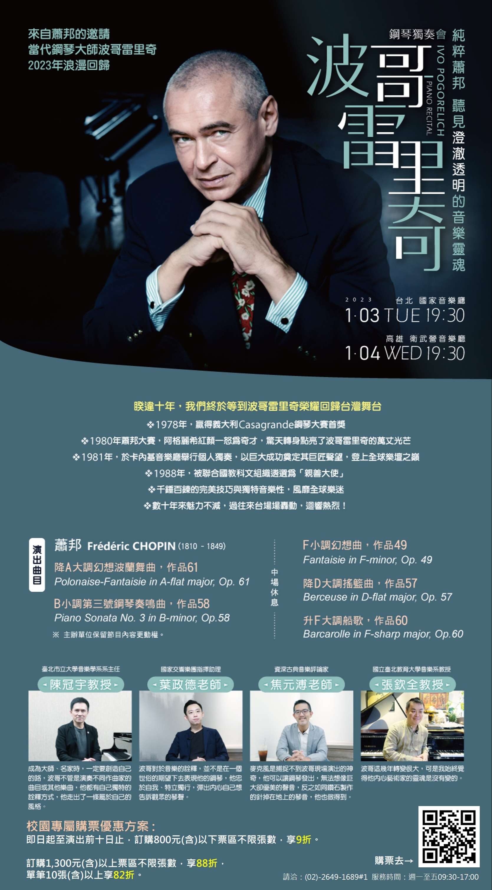 (三)表演介紹:生於南斯拉夫的「波哥雷里奇」自幼展現不凡的音樂天賦,在蕭邦大賽走紅後,他以獨特的演奏風格在樂壇佔有一席之地,光芒萬丈的魅力席捲全球,收服無數愛樂觀眾,使其一次又一次的回到觀眾席,聆聽他的演出。。過去總給人桀傲不群印象的他在邁入六十歲後,彷彿進入全新境界,愈顯深沉內斂。睽違已久,這位傳奇鋼琴家終於將回歸台灣舞台,以蕭邦系列經典曲目,再次驚豔樂迷的心。