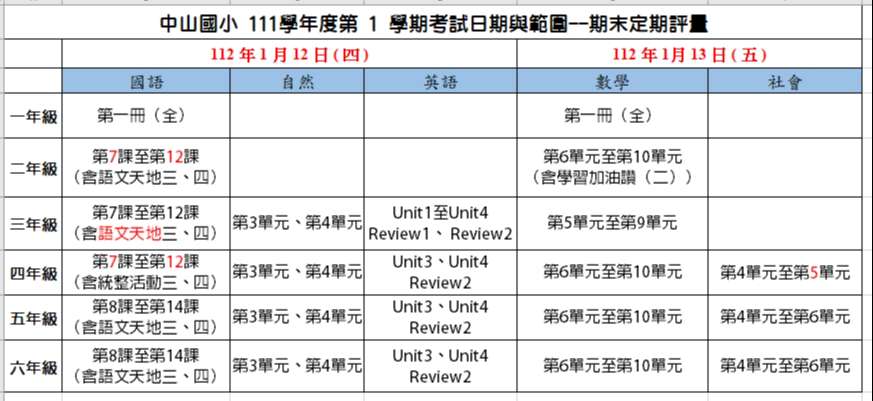 111學年度第1學期期末定期評量將於112年01月12日(四)、112年01月13日(五)兩天辦理,
