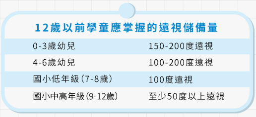 嬰幼兒的眼睛具備生理性遠視,可抵抗近視的發生,被視為眼睛的健康存款,若過快消耗遠視儲備量,則恐進入近視危險期。