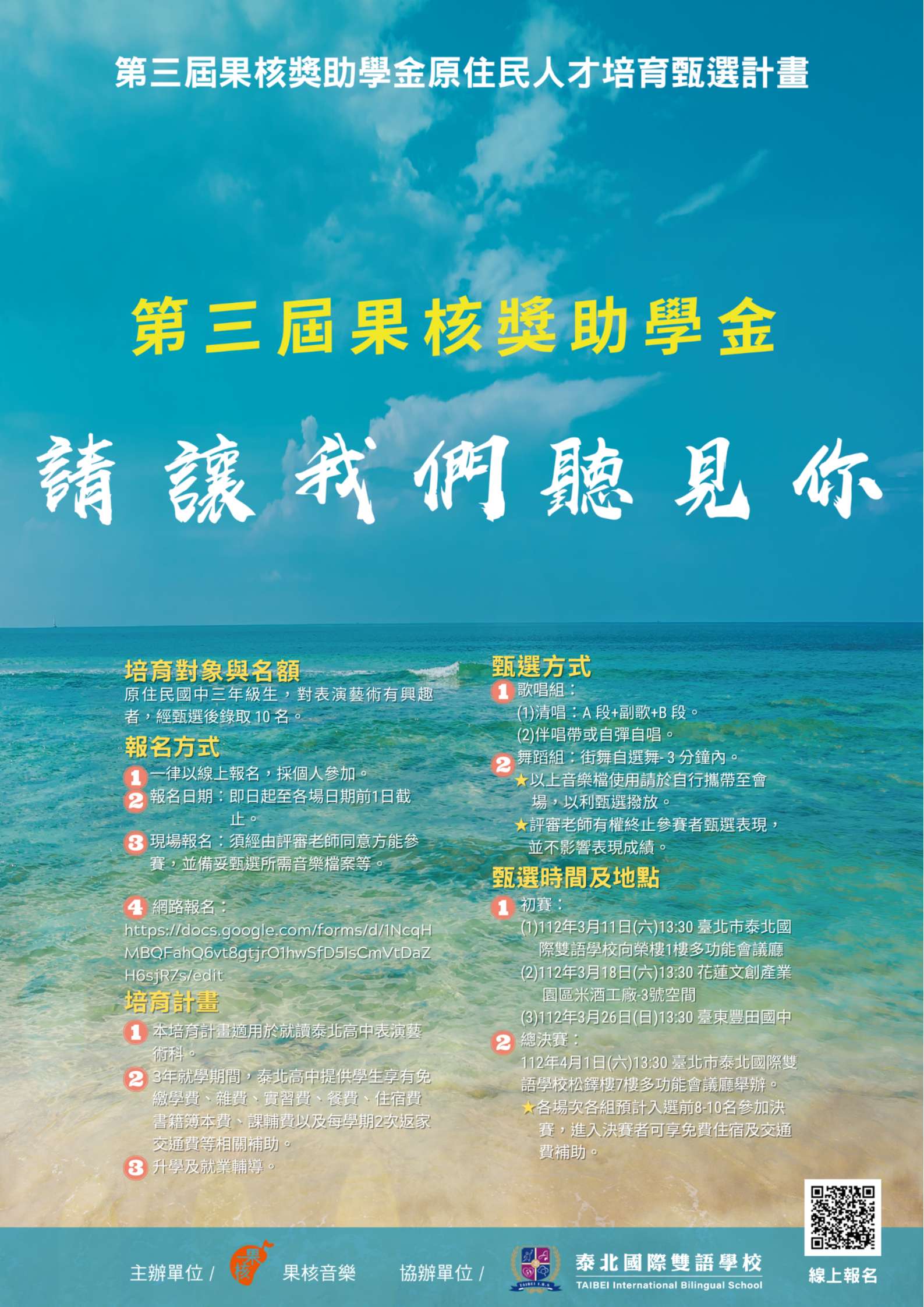 主旨:檢送「第三屆果核獎助學金原住民人才培育甄選計畫」, 鼓勵有興趣的同學報名參加。