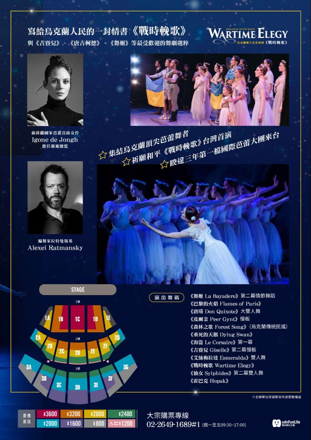 (三)表演介紹:烏克蘭聯合芭蕾舞團(United UkrainianBallet)集結一群烏克蘭頂尖芭蕾舞者,他們來自於烏克蘭各地劇院與舞團,因烏俄戰爭而流離失所,最後落腳荷蘭海牙,在此重拾舞鞋,恢復日常的訓練,組成一支職業舞團,在此作為烏克蘭芭蕾舞者的戰時庇護所。2022年烏克蘭聯合芭蕾舞團陸續巡演英國、澳洲、新加坡、美國等地,所到之處票券銷售一空,感動無數觀眾,讓世人見證藝術撫慰人心的神奇力量。本次舞團將帶來《戰時輓歌》、《吉賽兒》、《唐吉軻德》、《舞姬》等最受歡迎的舞劇選粹。《戰時輓歌WartimeElegy》是當代最重要的編舞家之一拉特曼斯基(Alexei Ratmansky)在烏俄戰爭爆發後的全新創作,但並未充滿政治訊息,相反地,他採用了烏克蘭當代最知名作曲家西爾維斯特洛夫(Valentin Silvestrov)的音樂,加上烏克蘭傳統歌曲,是拉特曼斯基寫給烏克蘭人民的一封情書,向他們堅韌不拔的精神致敬,並祈禱未來的和平。其他精采節目包括《舞姬La Bayadere》充滿動感與異國風情的第二幕;以雙手關節展現不可思議靈活度與生命力的《垂死的天鵝The Dying Swan》;挑戰男女舞者技巧極限的《海盜 Le Corsaire》第一幕;以及《唐吉軻德Don Quixote》的大雙人舞等,其32鞭轉的難度完全不遜於黑天鵝在《天鵝湖》的高潮。此外,舞團更特邀世界其他頂尖舞團的烏克蘭舞星,包括前馬林斯基首席Anastasia Matvienko與Denis Matvienko,以及英國國家芭蕾的Katya Khaniukova等人加入客席陣容,為台灣民眾帶來一場最精采的芭蕾盛宴,希望以藝術感動人心,為這個紛擾的世界帶來光明與希望。