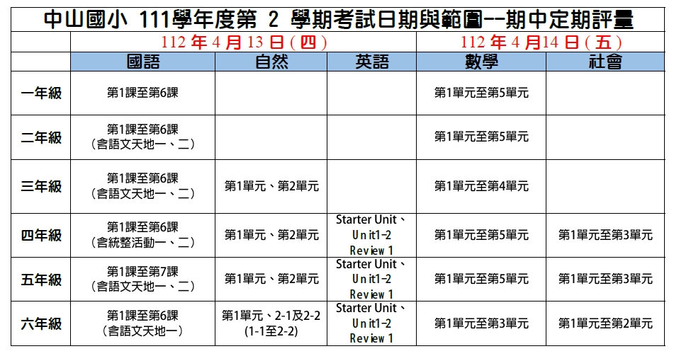 111學年度第2學期期中定期評量將於112年04月13日(四)、112年04月14日(五)兩天辦理,