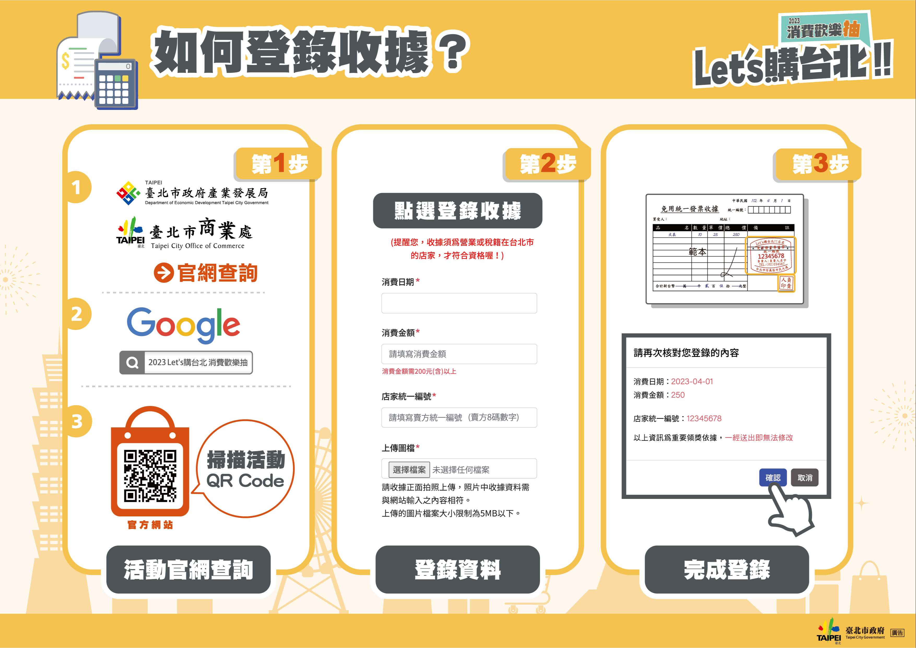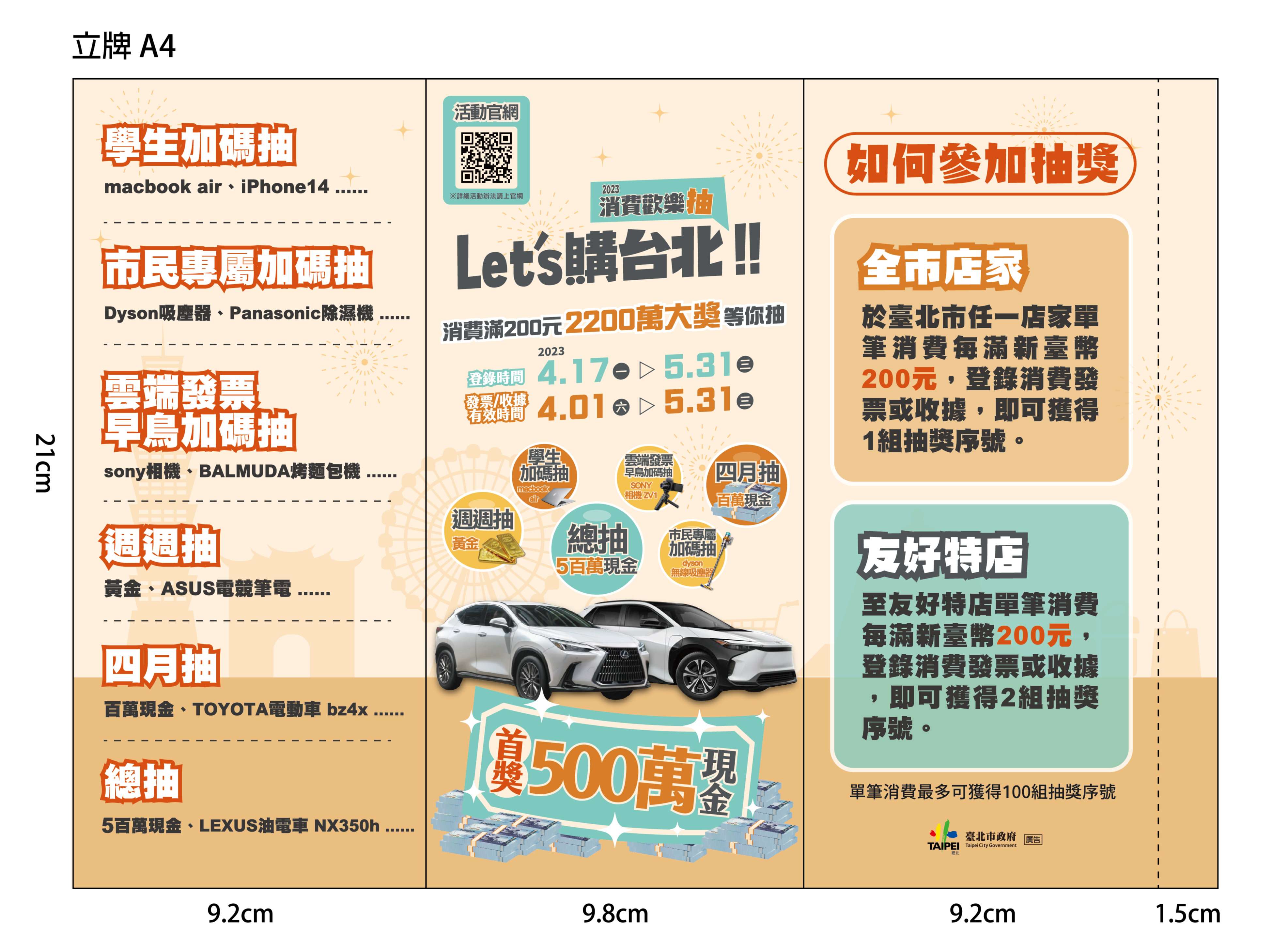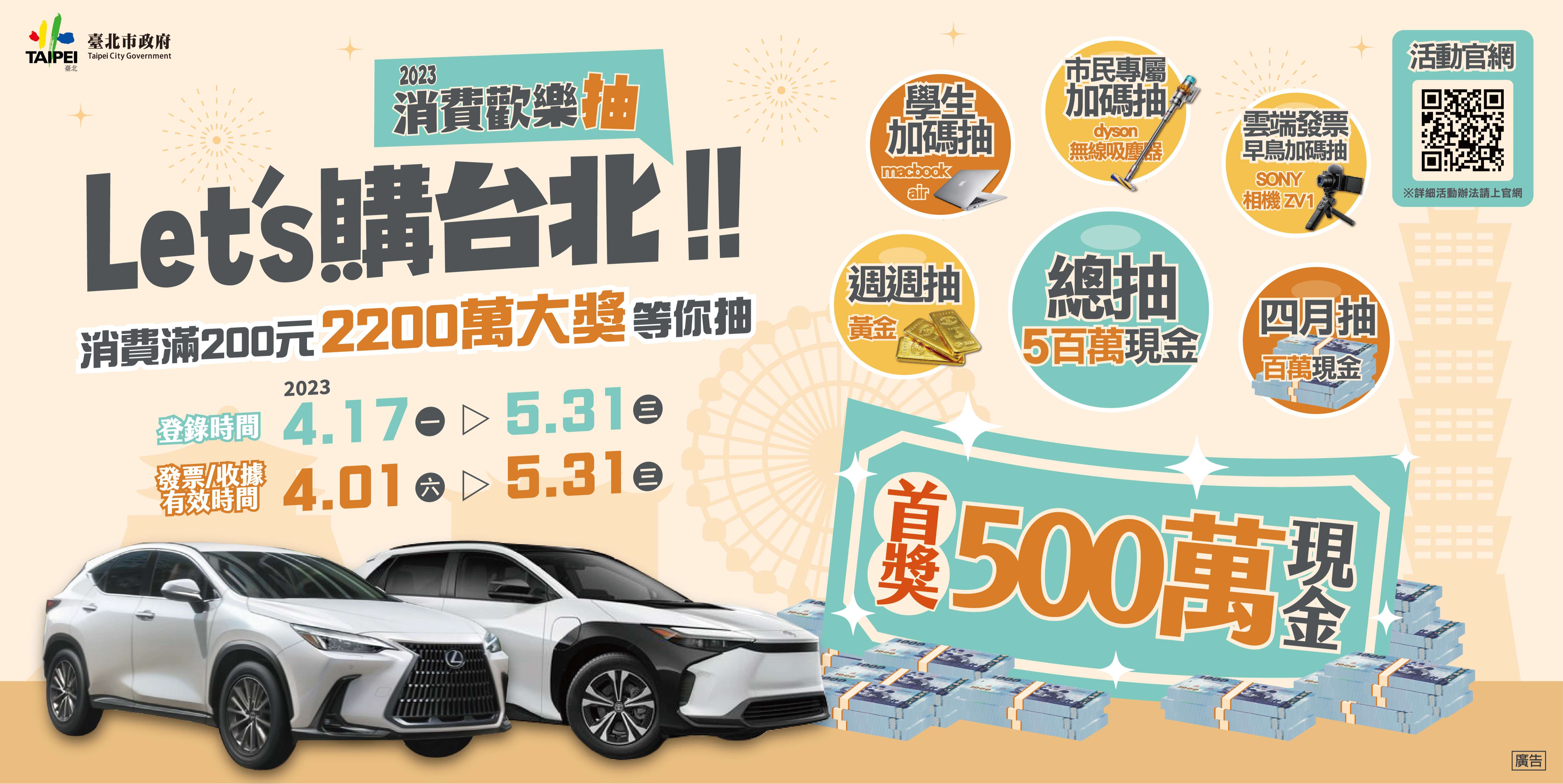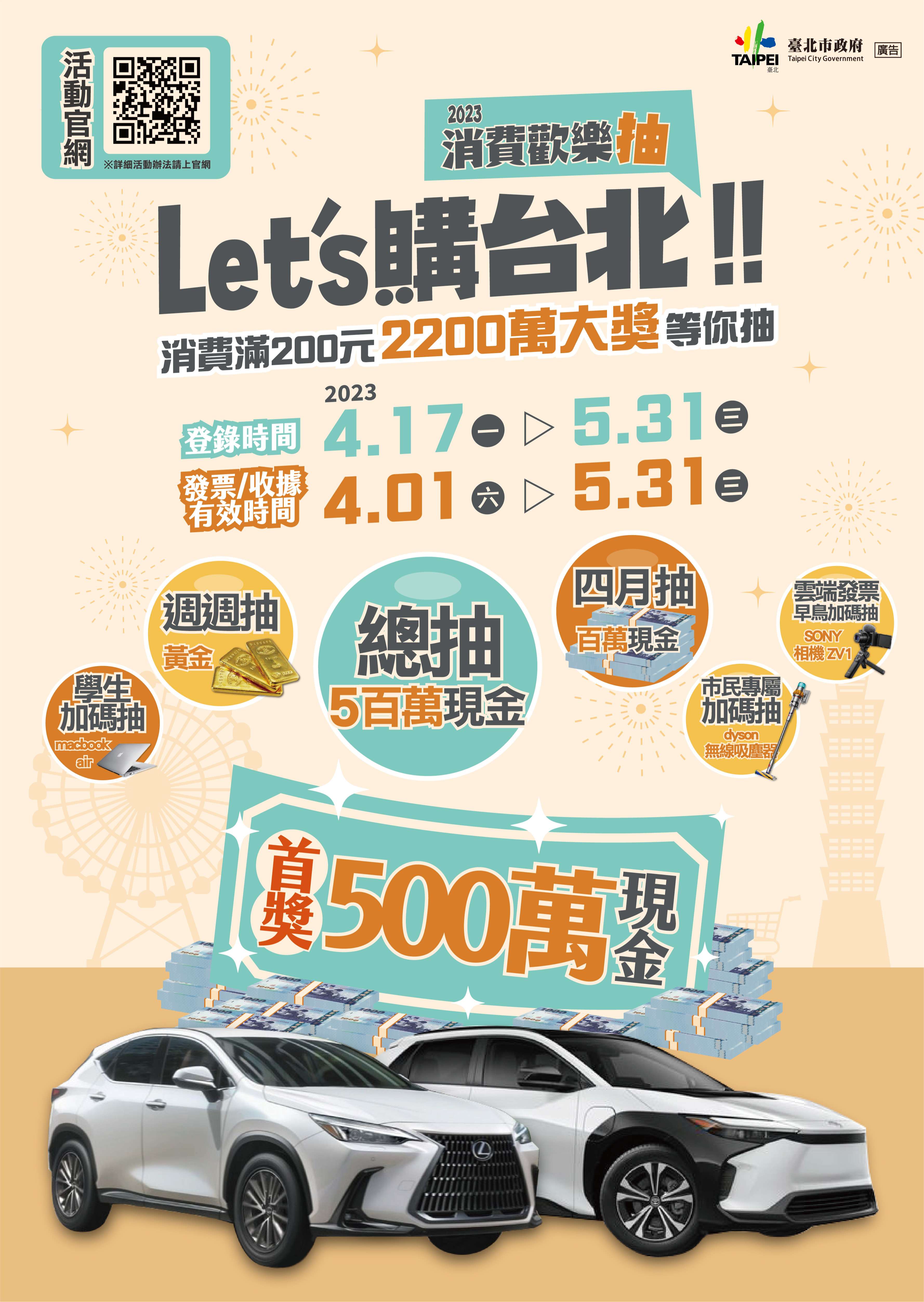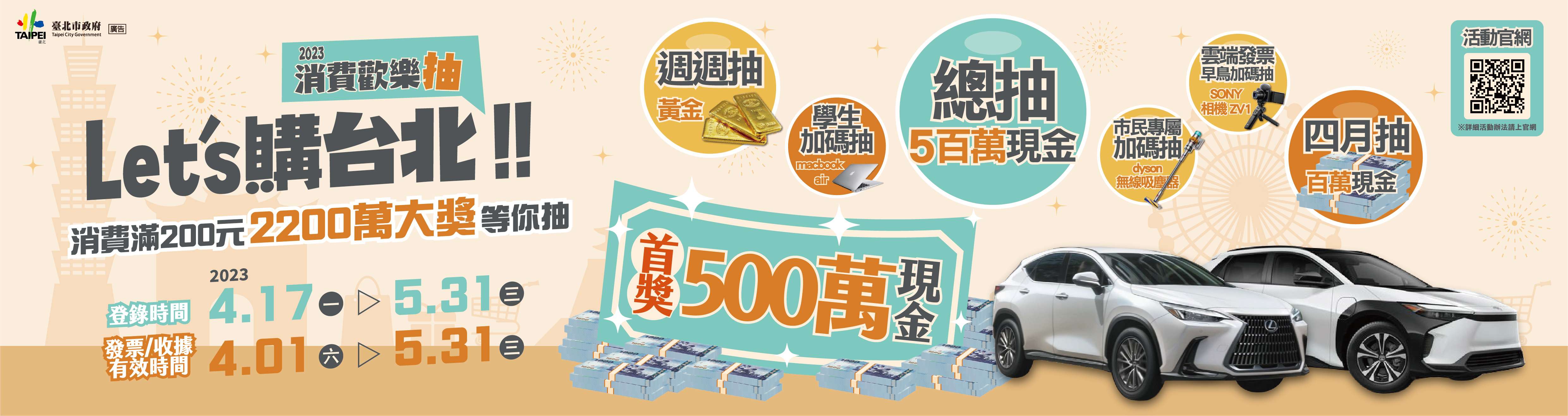 購台北消費歡樂抽」消費抽獎活動,消費登錄週週抽、四月抽、總抽、學生加碼抽、雲端發票早鳥加碼抽、市民專屬加碼抽及母親節感恩抽等活動,並透過串聯本市超過