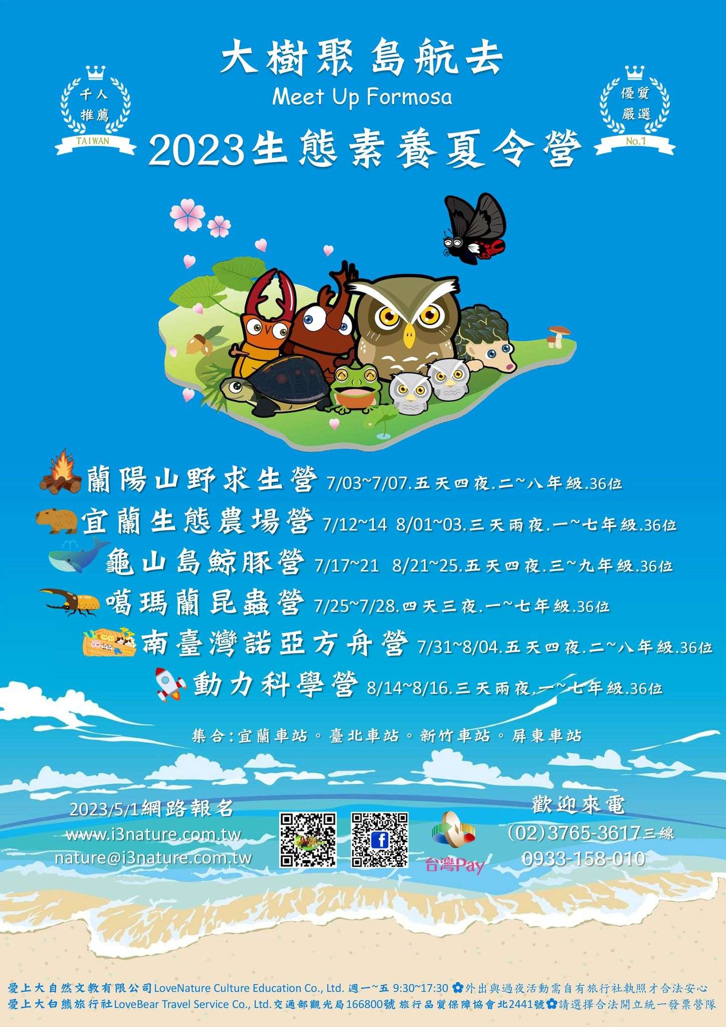 三、課程主題:蘭陽山野求生營(五天四夜)、宜蘭生態農場營(三天兩夜)、龜山島鯨豚營(五天四夜)、噶瑪蘭昆蟲營(四天三夜)、南臺灣諾亞方舟營(五天四夜)、動力科學營(三天兩夜)。