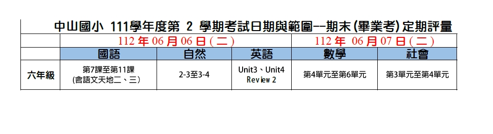 111學年度第2學期六年級期末定期評量將於112年06月06日(二)、112年06月07日(三)辦理。