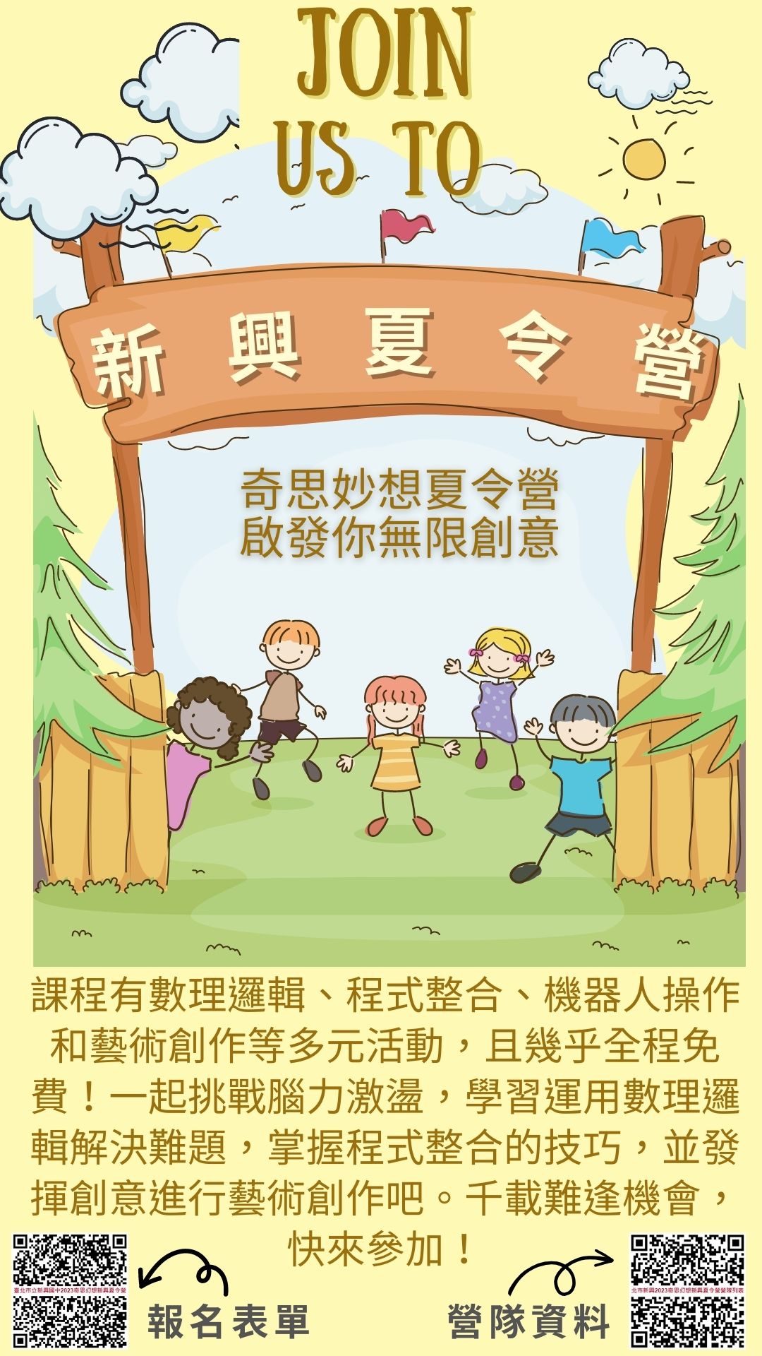 一、本校將於112年暑假辦理「2023奇思幻想新興夏令營」活 動,誠摯邀請貴校五升六年級學生參加