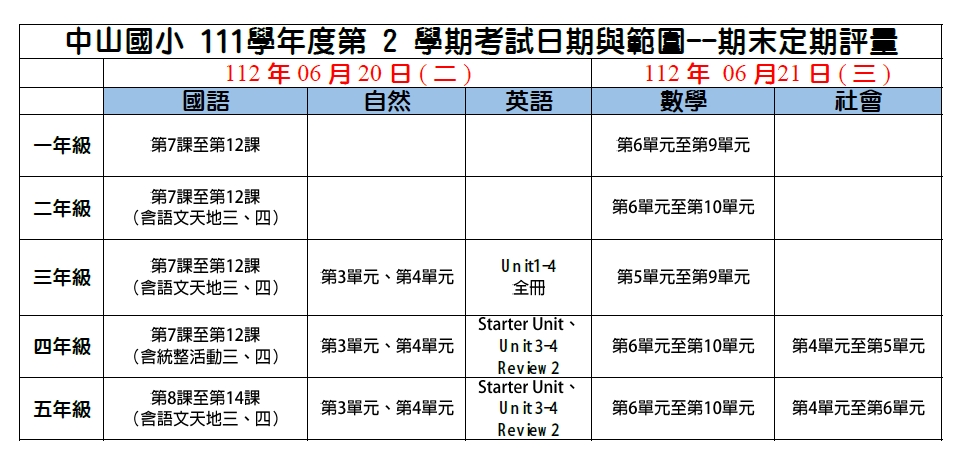 111學年度第2學期六年級期末定期評量將於112年06月20日(二)、112年06月21日(三)辦理。