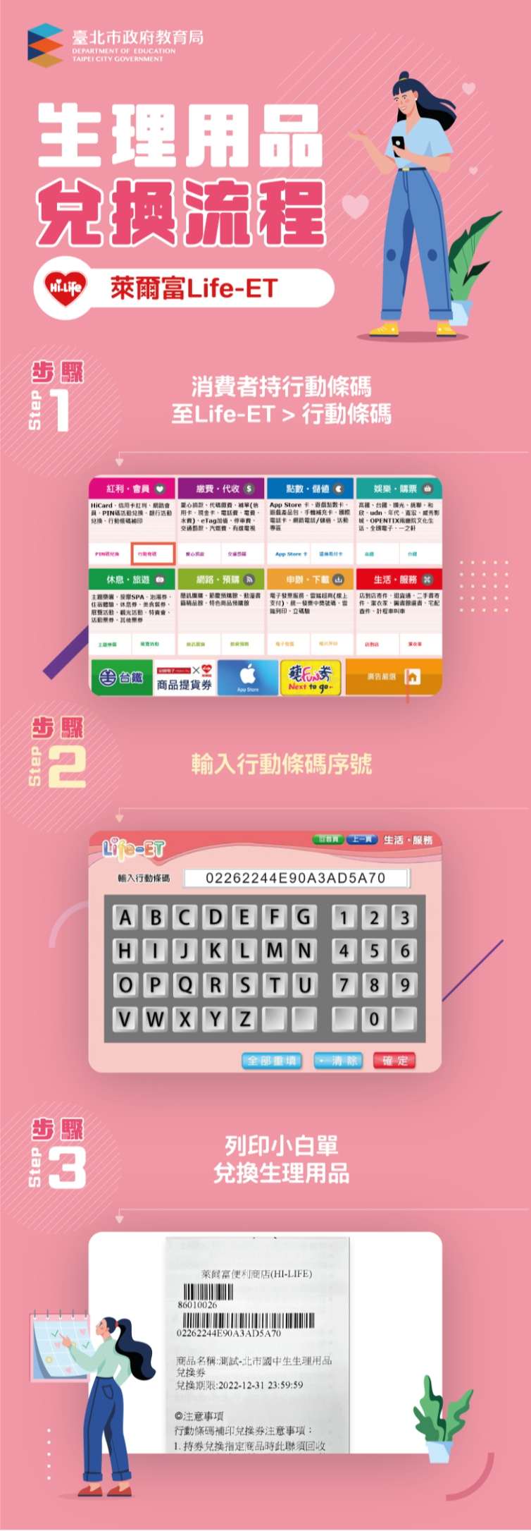 二、「112年國中小女性生理用品補助計畫」第4期兌換券2張, 將於112年6月1日發放,兌換效期至112年7月31日止。
