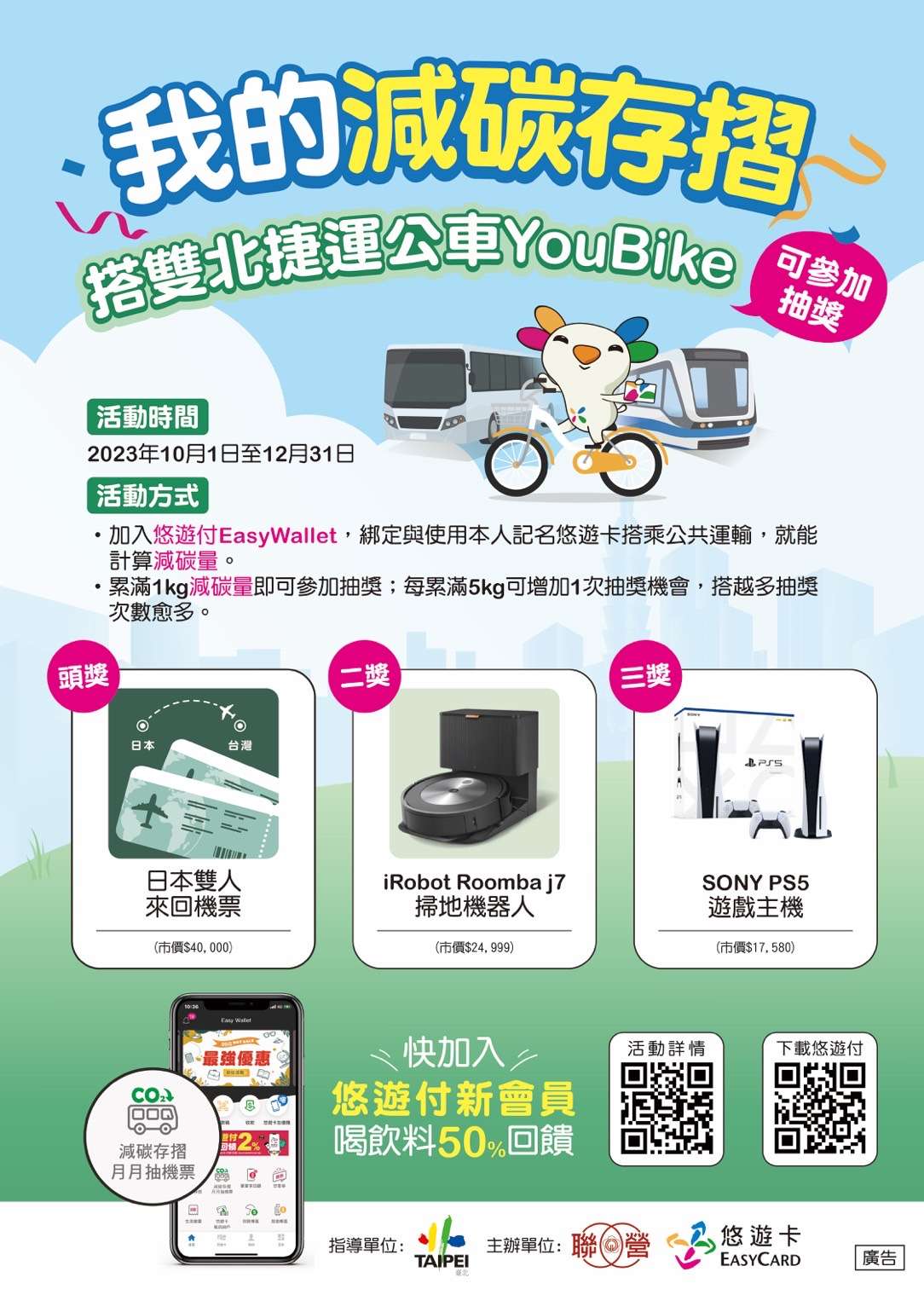 活動於112年10月1日至112年12月31日止,只要加入「悠遊付Easy Wallet」APP會員,綁定與使用本人記名悠 遊卡,搭乘雙北公共交通運具(公車、捷運、輕軌及 YouBike)就能計算減碳量。累計滿1kg減碳量即可獲得當 月抽獎資格1次,每累計滿5kg,可再增加1次抽獎機會,累 計滿10kg則多2次,以此類推,搭乘公共運輸越多,就有越多中獎機會。