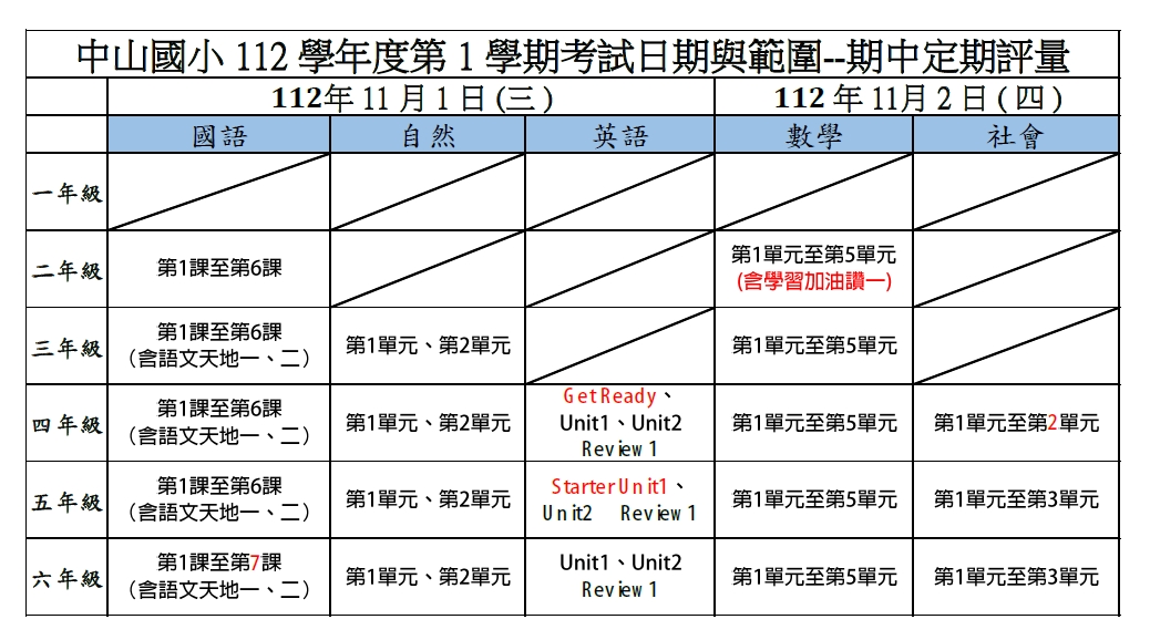112學年度第1學期期中定期評量將於112年11月1日(三)、112年11月2日(四)辦理,考試範圍如下,祝福所有孩子都能有充分的準備與表現。加油!