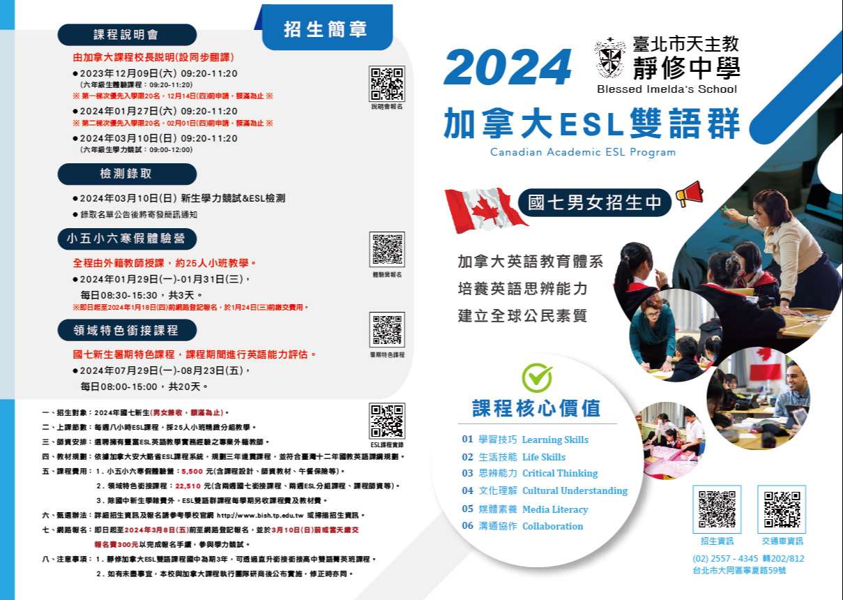 二、加拿大ESL雙語寒假體驗營時間:113年1月29日(一)至1月 31日(三)對象:國小五、六年級學生體驗營費用:5500元報名方式:掃描海報QR code,課程諮詢請洽賴怡伶組長。 電話:02-2557-4345 分機202、812。