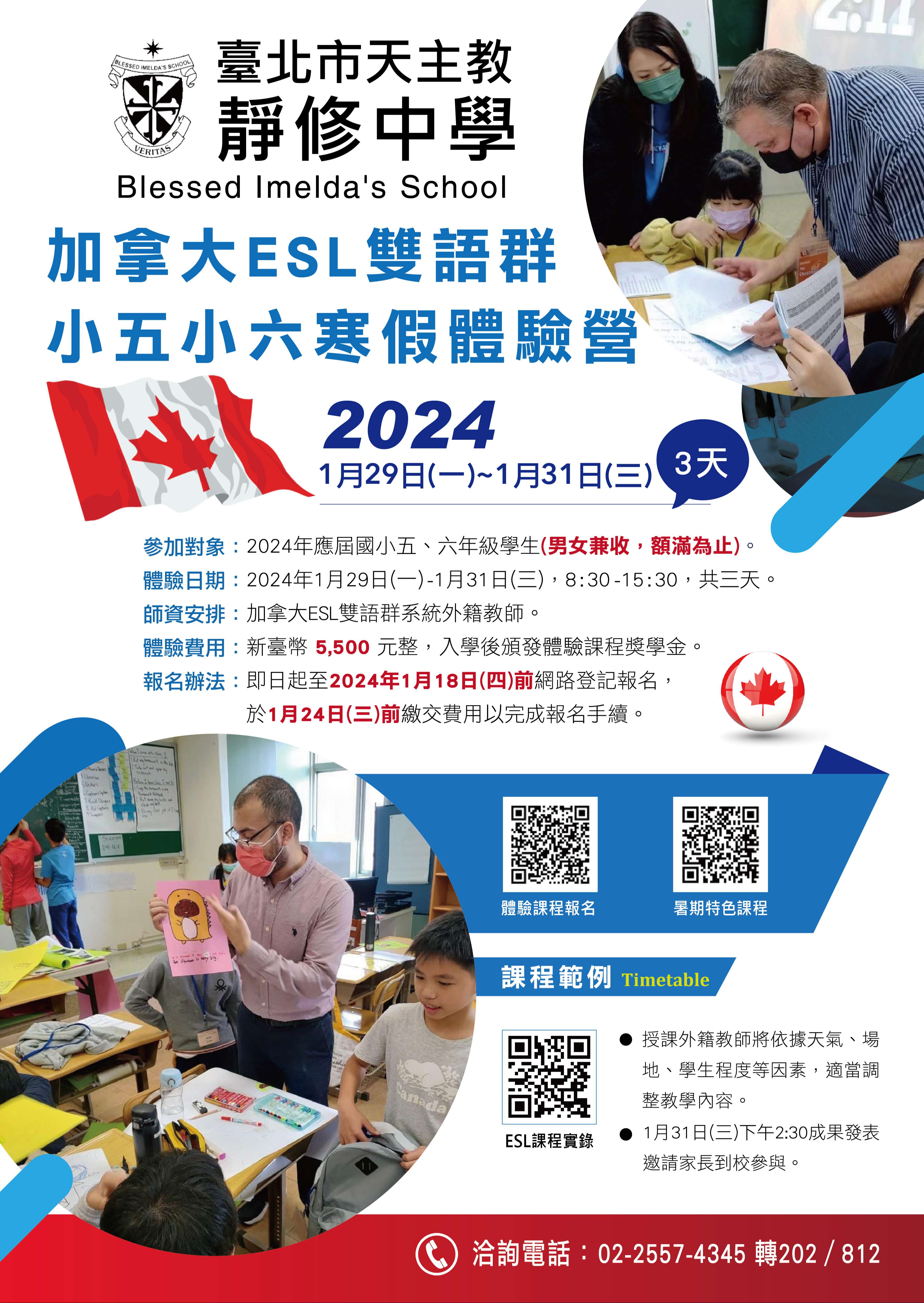二、加拿大ESL寒假體驗營 (一) 日期:113年1月29日(一)至1月31日(三),共3天。 (二) 時間:08:30-15:30。 (三) 對象:國小五六年級學生。 (四) 營隊費用:5,500元。