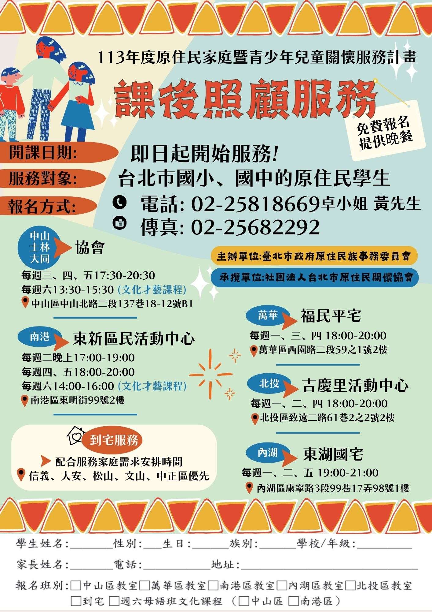 1. 臺北市政府原住民族事務委員會委託社團法人台北市原住民關懷協會辦理「112 年原住民家庭暨青少年兒童關懷服務計畫」,歡迎原住民家戶踴躍報名參加。