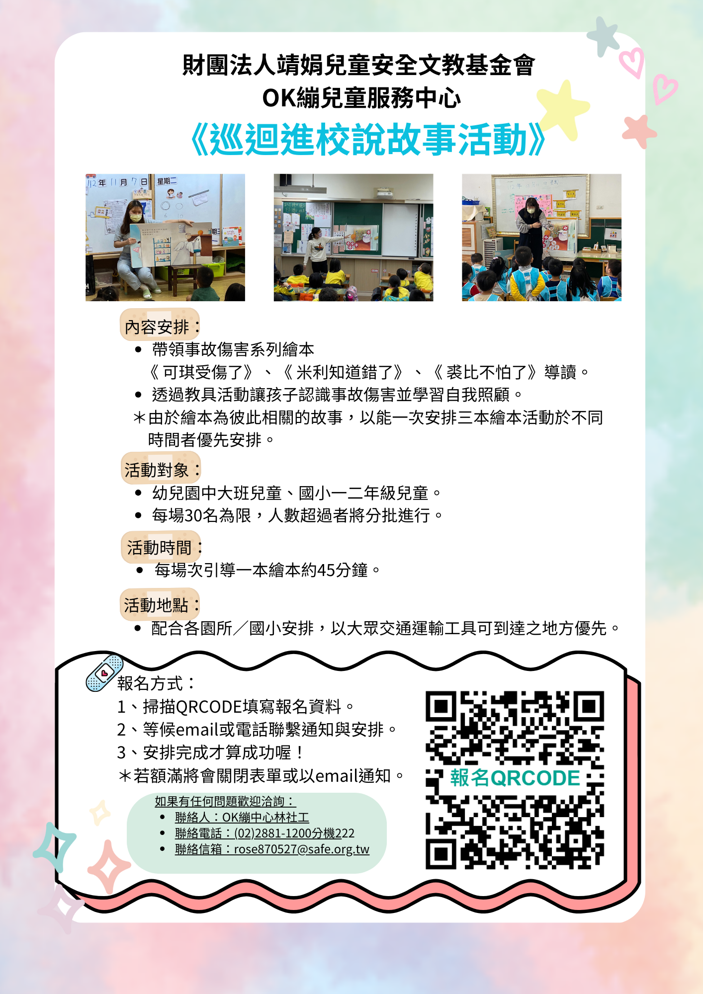 二、該基金會欲透過繪本說故事活動,帶領兒童覺察自我並學 習自我照顧,期讓事故傷害繪本成為教師與孩子互動媒 材,請有意報名之園所、學校逕向該基金會報名。