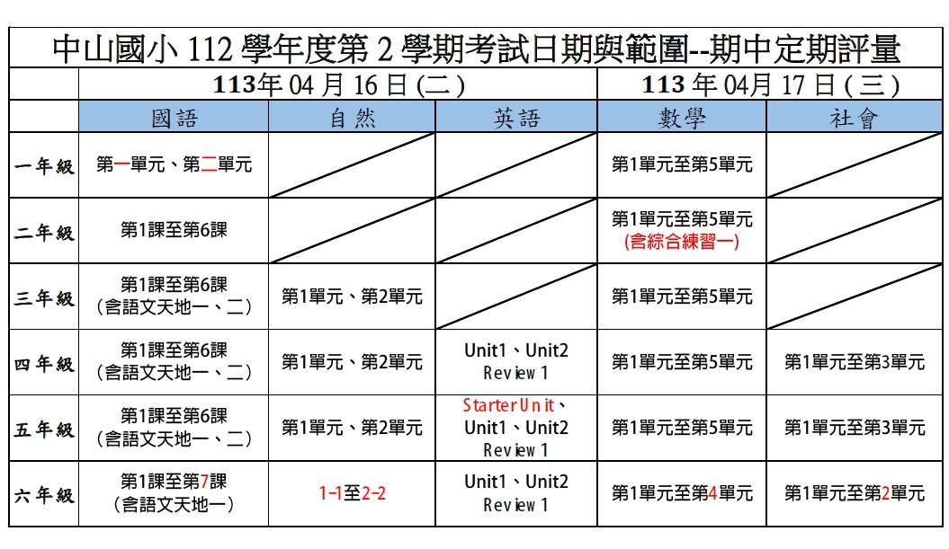 111學年度第2學期期中定期評量將於113年04月16日(二)、113年04月17日(三)兩天辦理,