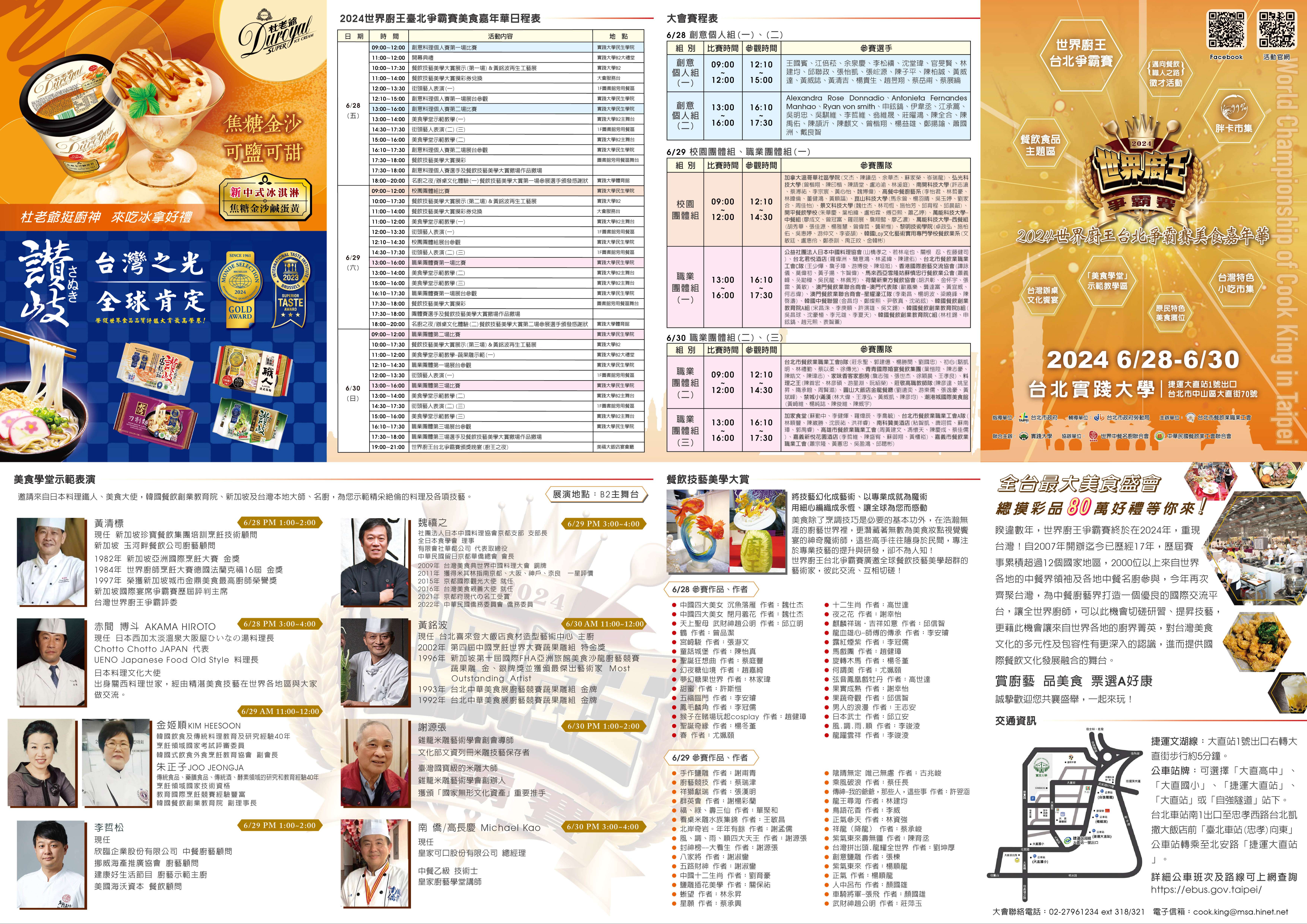 二、為提升勞動者職業技能拓展國際視野,臺北市餐飲業職業 工會辦理「2024世界廚王爭霸賽暨美食嘉年華」,該活動 訂於113年6月28日至6月30日假實踐大學辦理。