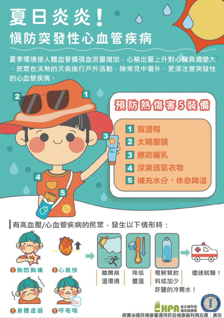 臺灣的夏天經常是炎熱又潮濕,導致民眾容易因為身體無法正常調節高溫,發生熱傷害的情形。常見的熱傷害包括熱痙攣、熱衰竭、中暑等,又以中暑最嚴重,若處理不當,會導致器官衰竭,甚至死亡,其死亡率甚至可能超過30%。熱傷害是可以預防的,因此,國民健康署依據不同族群之熱傷害預防方法、症狀及處理方式等,製作相關主題專文、手冊、影片、警語等,提供民眾運用,以減少熱傷害對於健康之危害。