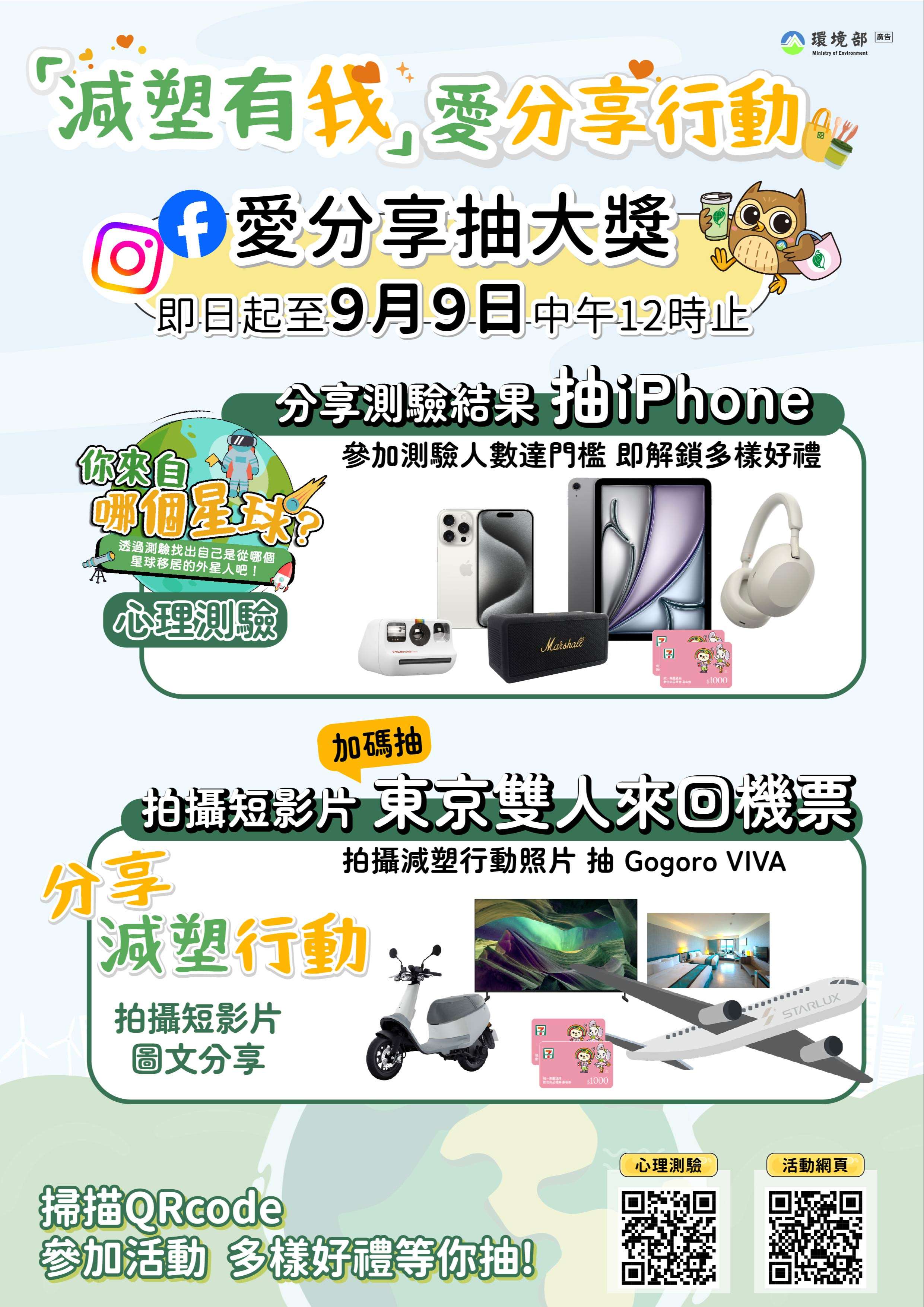 一、環境部為鼓勵社會大眾及莘莘學子在暑期假期間一起跟上 全球減少塑膠的風潮,特辦理「減塑有我」愛分享行動, 可透過臉書(Facebook)、Instagram(IG)等社群媒體, 拍攝個人生活中減塑短影片、減塑生活照片,並可透過參 加「你來自哪個星球?」心理測驗遊戲,瞭解並發覺屬於 自己獨特的環保行動,歡迎民眾邀請親朋好友一起在生活 中響應減塑行動,參加旨揭活動拿大獎。